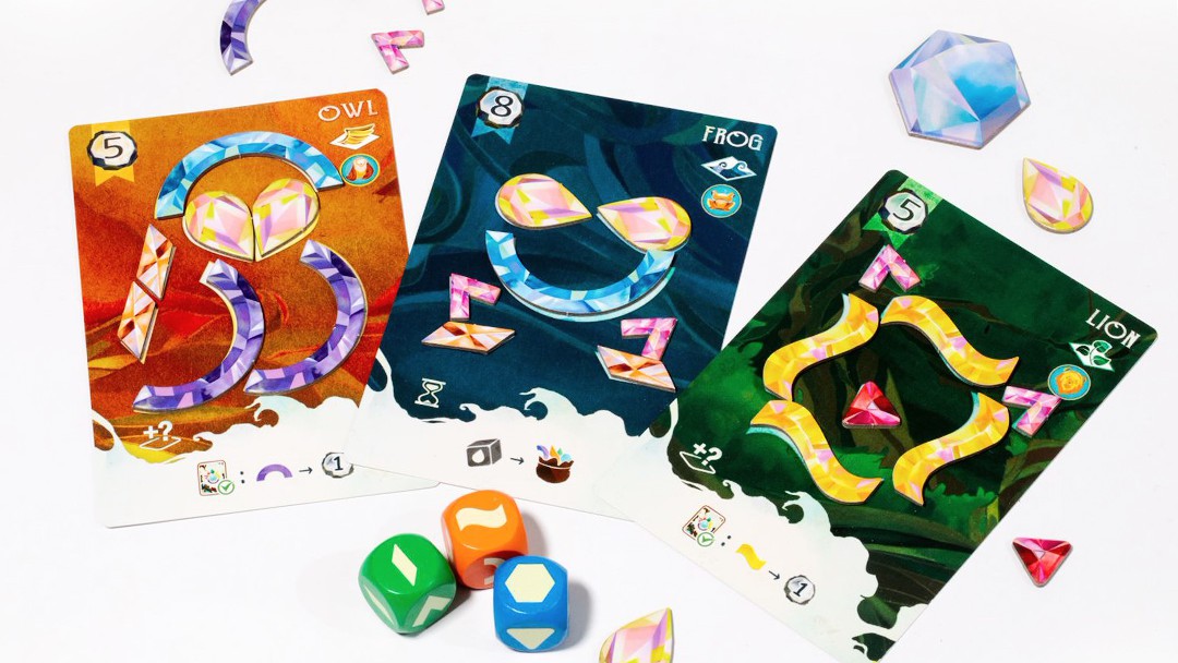 Tyto tvary jsou v podobě žetonů bezpečně uložené v pořadači uvnitř krabičky hry a postupně je vykládáte na svou kartičku zvířete. A jak? Vrháním plné hrsti kostek! Kostky jsou tří druhů s různou pravděpodobností padnutí jednotlivých tvarů.