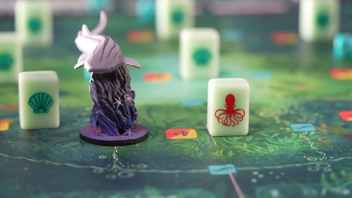 Mezitím ovládání chobotnice se spíše spoléhá na strategii. Musíte se rozhodnout, jestli žralokovi budete pokládat pasti, případně se nebudete bát a vyrazíte přímo za ziskem potravy. Rovněž se můžete zaměřit na rychlé pohyby a skrývání. Ať už se ale rozhodnete jakkoli, místo kostek zde budete hrát karty z ruky odhalováním jednotlivých bloků na herním poli, které lze přesouvat a míchat. Tudíž se v tomto případě jedná o deckbuilding.