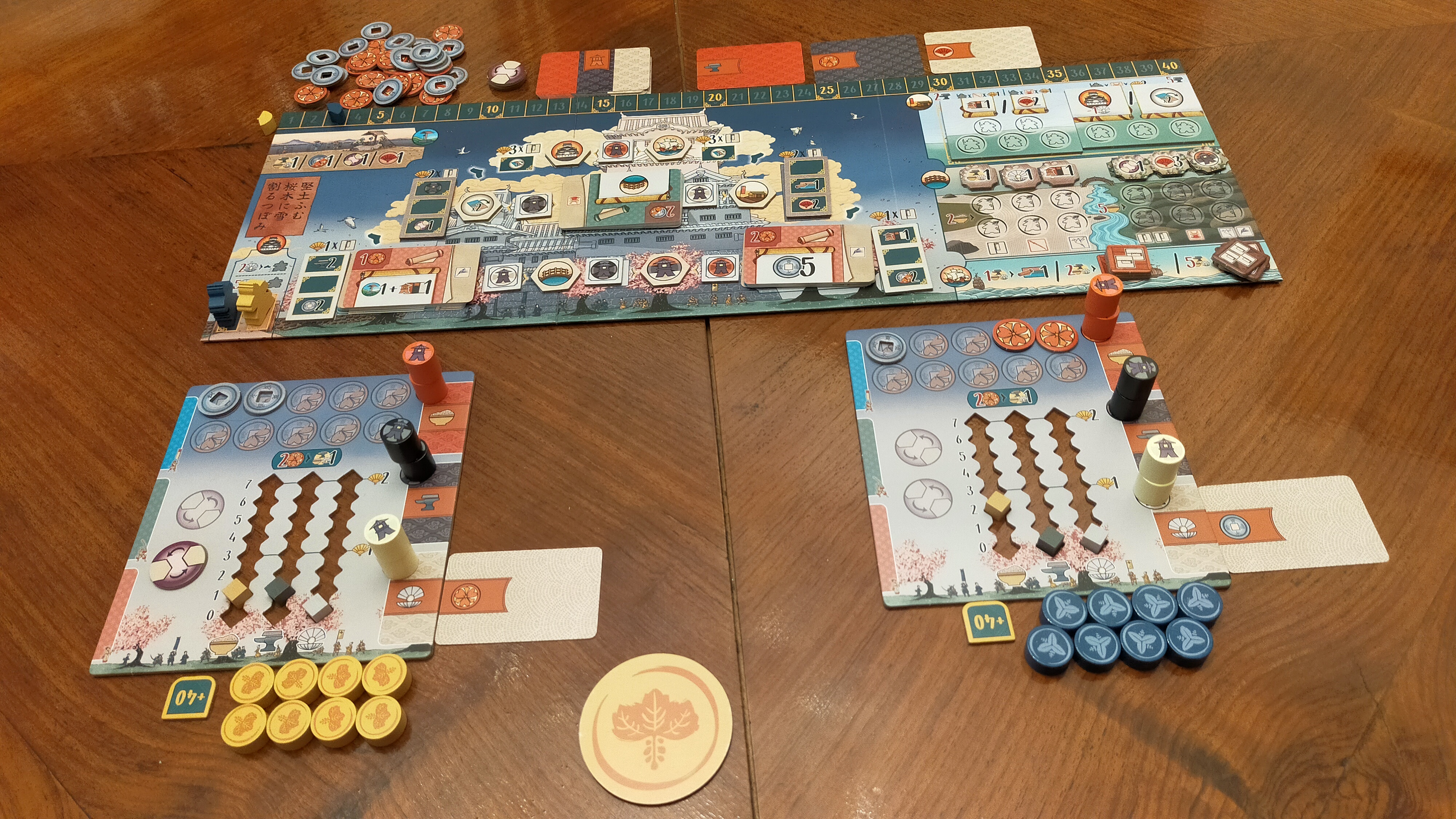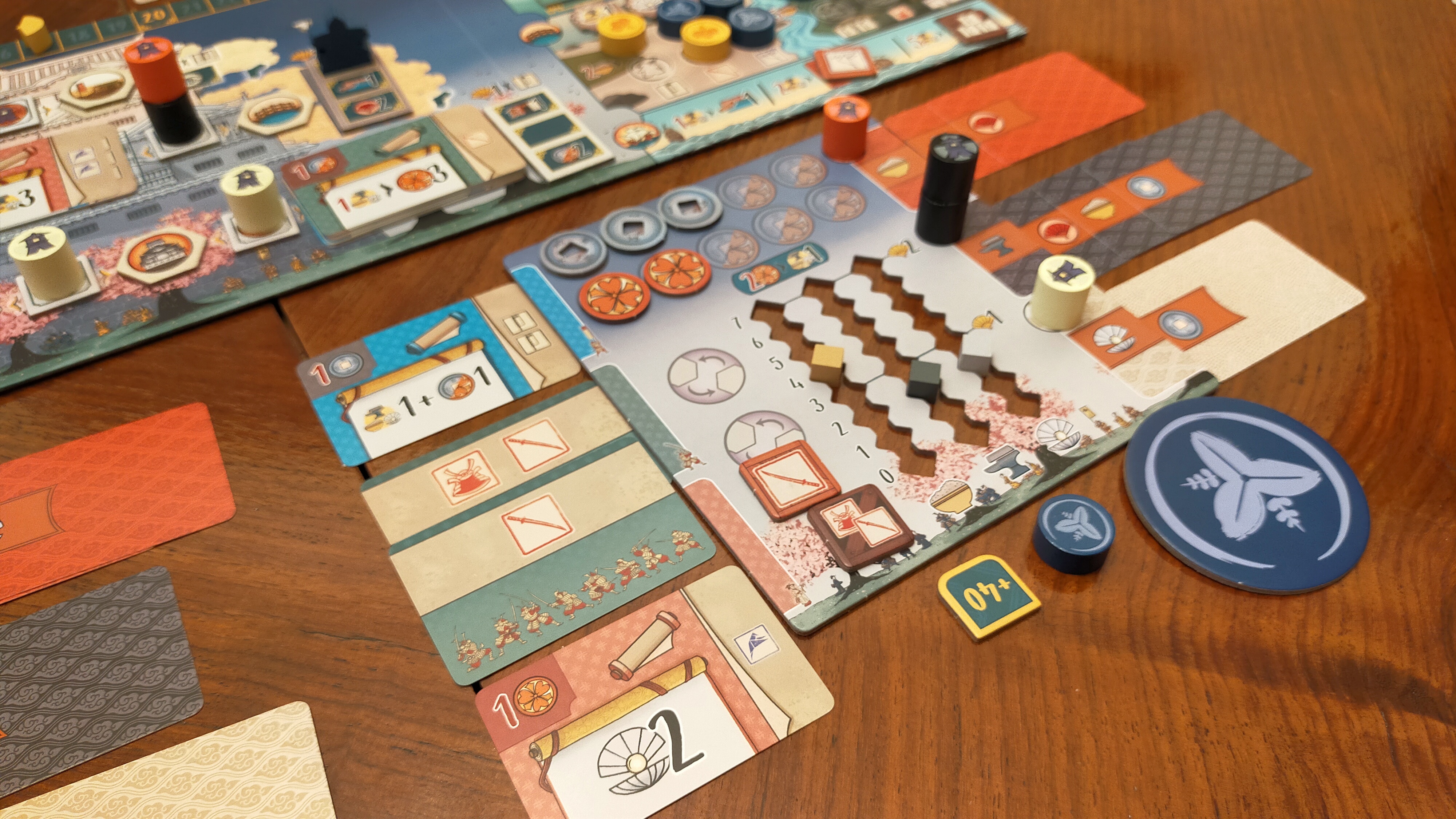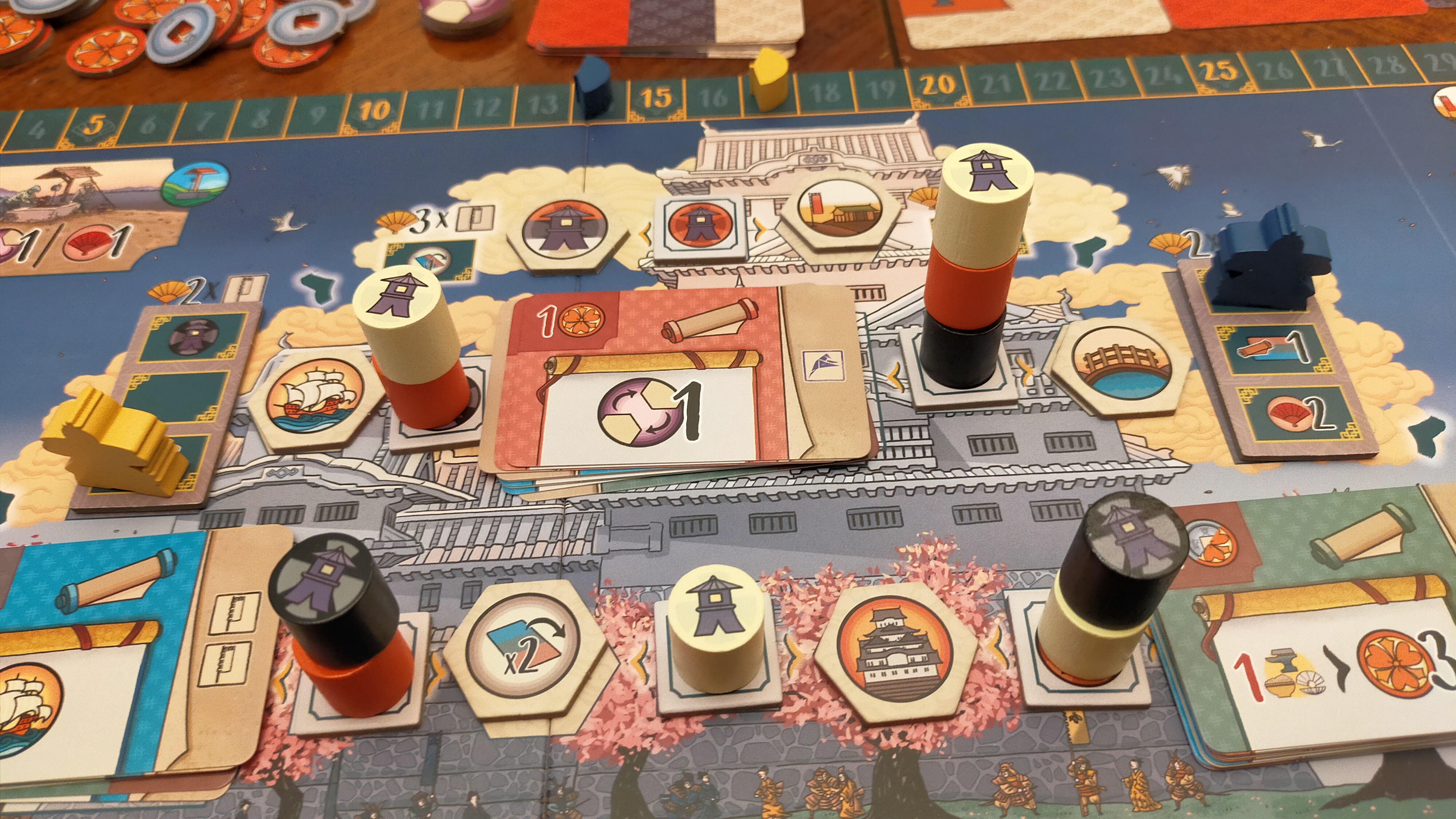 Jakmile váleček položíte, okamžitě aktivujete zisk zdrojů z barvy lucerny, kterou jste právě zakryli. Ve stahovacím kole se řídíte barvou odebrané lucerny. Získáte všechny viditelné odměny v dané barevné oblasti – suroviny, mince, pečetě daimjóa nebo body klanu. Čím víc karet luceren v jedné barvě nasbíráte, tím silnější budou tyto aktivace, a právě tady se postupně rozjíždí váš engine.