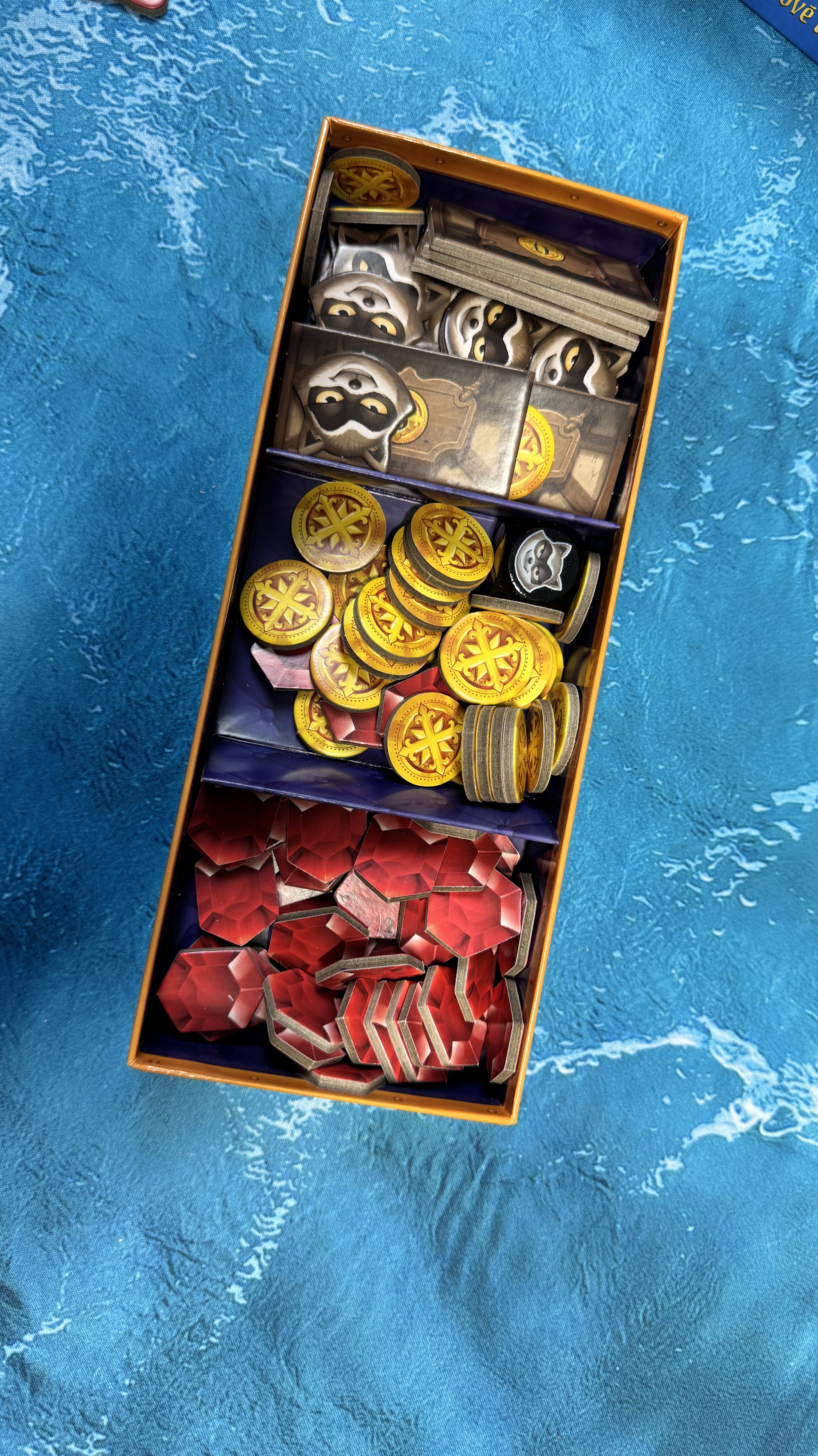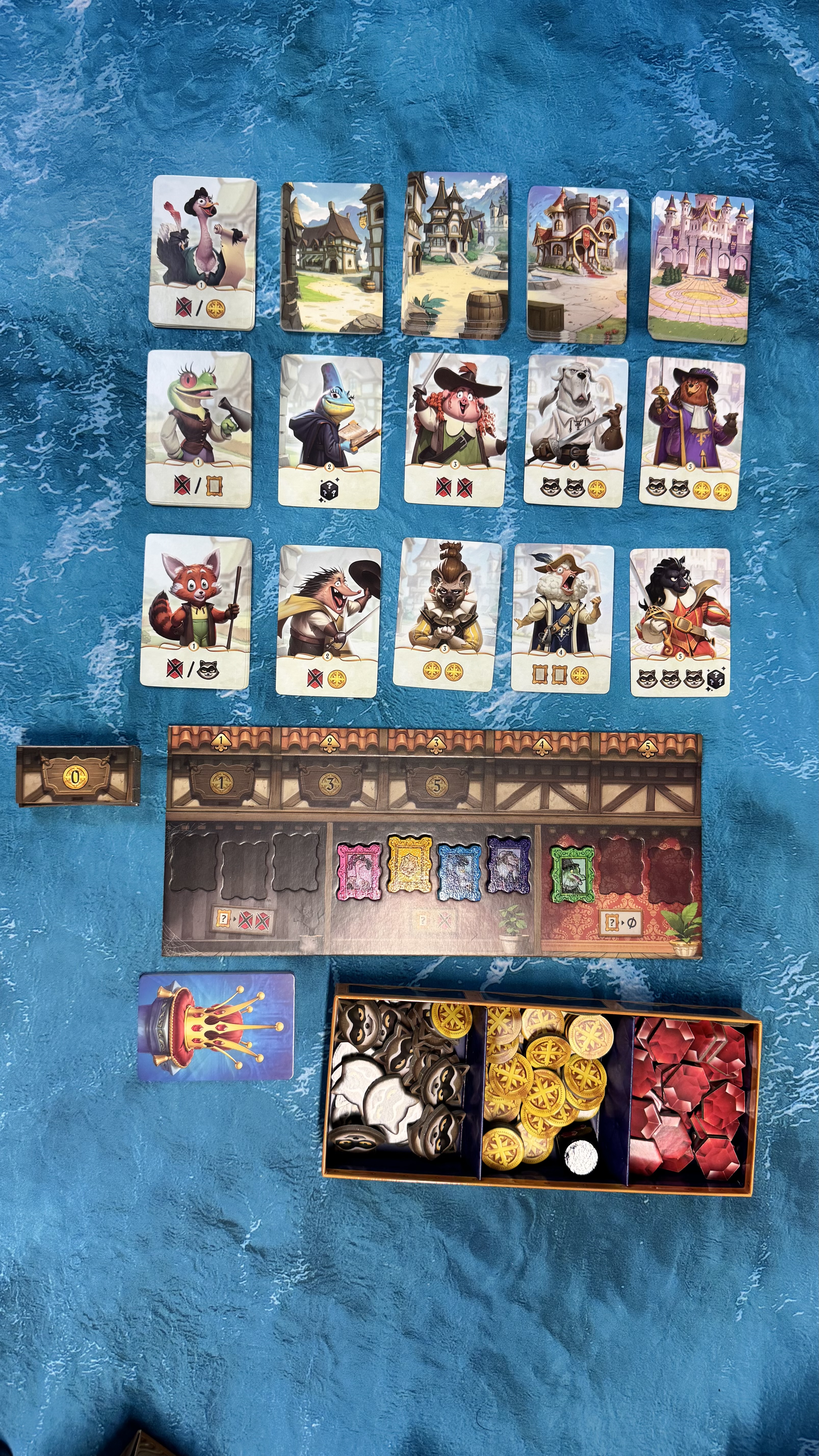 Tady ale půjdu o trochu dále, protože vše ve hře je opravdu nádherně zpracované. Dvouvrstvá kartonová deska, každý šlechtický rod má svou vlastní krabičku (pokladnici), do které se dávají získané peníze i rubíny, nebo je naopak odsud musí platit. Nechybí krabička na žetony zdrojů a pak krásné karty a plastové obaly.