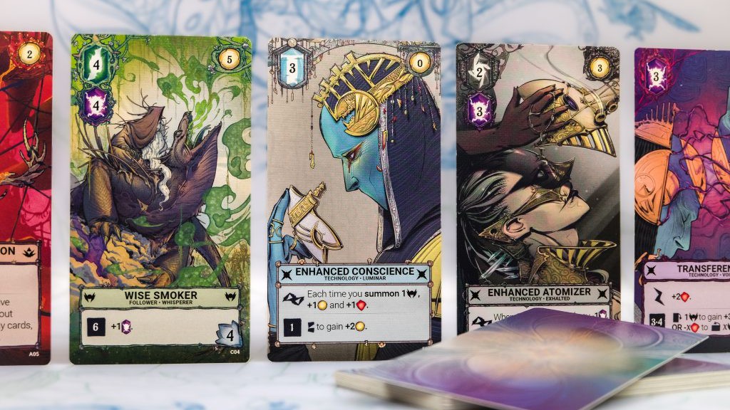 Můžete například zahrát kartu z ruky (následovníka, který vám pomůže v boji; mocný rituál; artefakt upravující vaše možnosti), ale zahrání karty stojí koncentrovaný éter, který musíte nejprve jinou akcí získat z jedné z nahozených kostek. Její barva a symbol zároveň mohou spustit nejrůznější efekty na vašich již zahraných kartách.