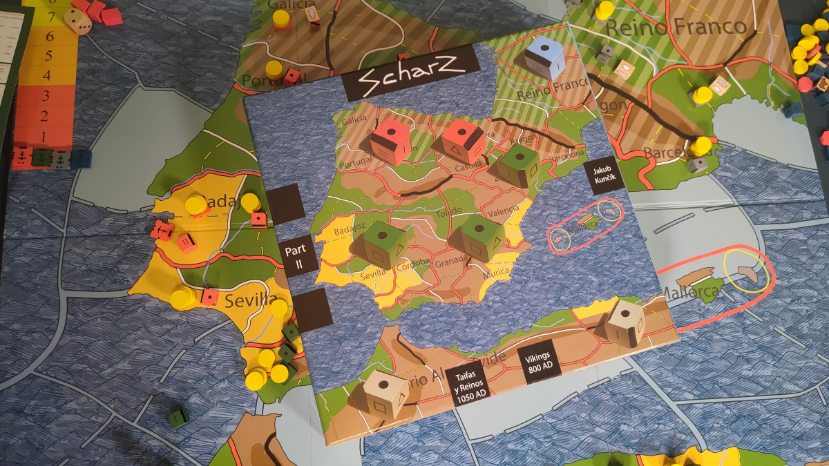 Poslední dva řádky jsou ale jakousi utopií, tedy ideálním stavem, jak by to ve hře asi mělo fungovat. Jenže realita je bohužel úplně jiná. Tím se dostáváme k tomu, co je na celém Scharzu nejhorší – pravidla. Je samozřejmě potřeba říct, že jsem měl k dispozici prototyp, jak můžete vidět z fotografií. Mapa rozhodně není hezká, ale pro účely prototypu byla její barevnost velmi funkční.