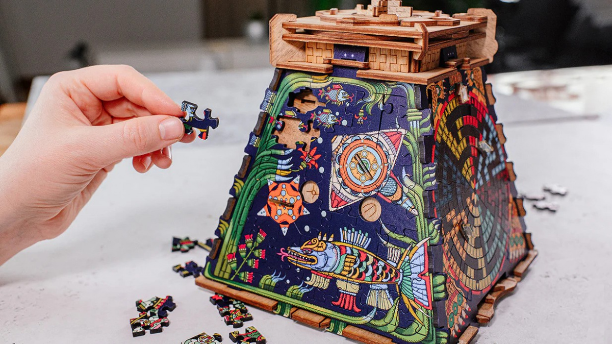 CluePuzzle totiž spojuje mechanický hlavolam s klasickou skládačkou puzzle. Před sebou máte 3D pyramidu slunce z oblasti Teotihuacánu, jejíž čtyři stěny zejí prázdnotou. Tedy prozatím. Brzy je totiž vyplníte krásným obrázkem z puzzlů, který vám napoví, jak pokračovat s hlavolamem – kde za co zatáhnout, čím otočit, aby vydal svá tajemství.