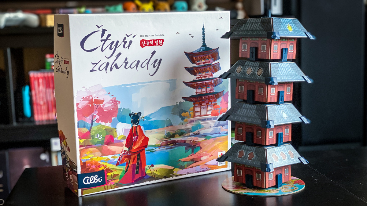 Přivábí vás ale také svou dominantní herní komponentou, která bude středobodem každé partie – obrovskou kartonovou pagodou, kterou během hry různě otáčíte. Je tahle majestátní věž jen vizuální vábnička, nebo se snoubí krása s funkčností? A jak vlastně samotné stavění zahrad funguje? A hlavně – je to zábava?