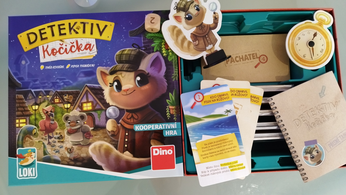 Rozměry krabice odpovídající délce jedné hry a ve vaší sbírce deskovek bude patřit k těm menším. Není to však žádná výtka. Pro cílovou dětskou skupinu není podstatné zakrýt celý stůl žetony a kartami, ale spíše přehlednost a rychlost, s jakou je možné hru připravit. V krabici naleznete šest balíčků s případy, stejný počet obálek s pachateli, zápisník, hodinky, kartonovou figurku Detektiva Kočičky s plastovým podstavcem a herní kostku.