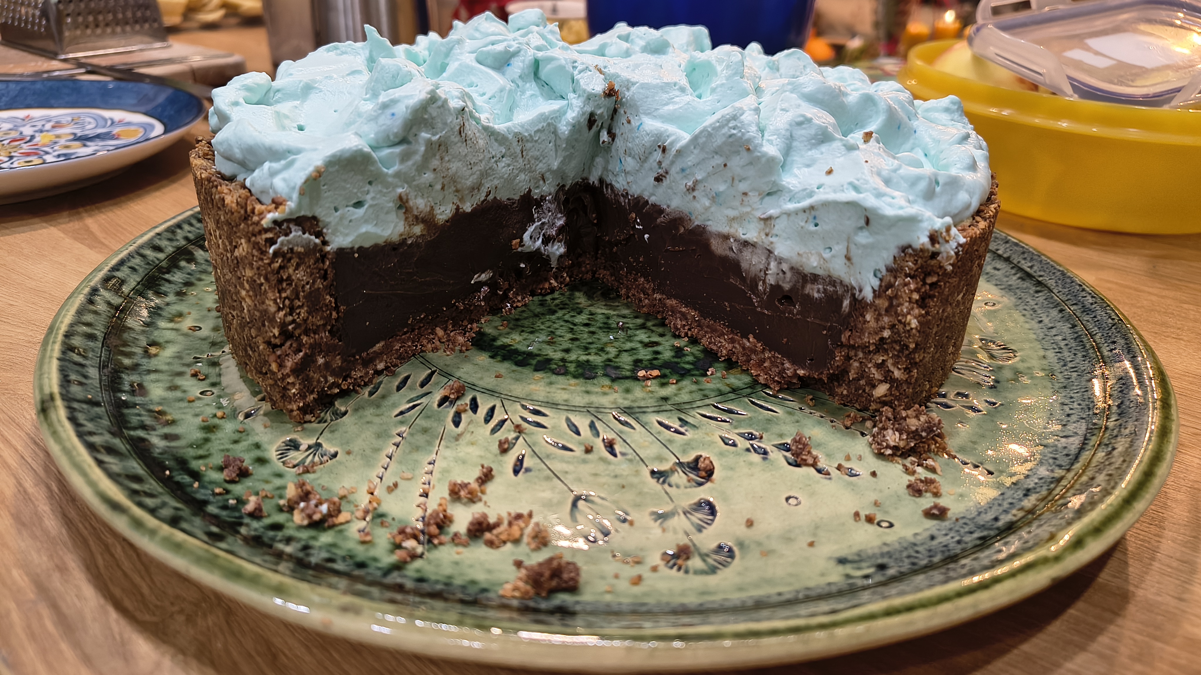 Nejenže parádně vypadá díky modrému barvivu ve šlehačce, která má evokovat přítomnost Quantum Coly, ale ta chuť! Sušenkový korpus, čokoládou nabouchaný pudink a již zmíněná šlehačka dohromady vytváří neuvěřitelnou symfonii. Po dortu se v rodinném kruhu jen zaprášilo.