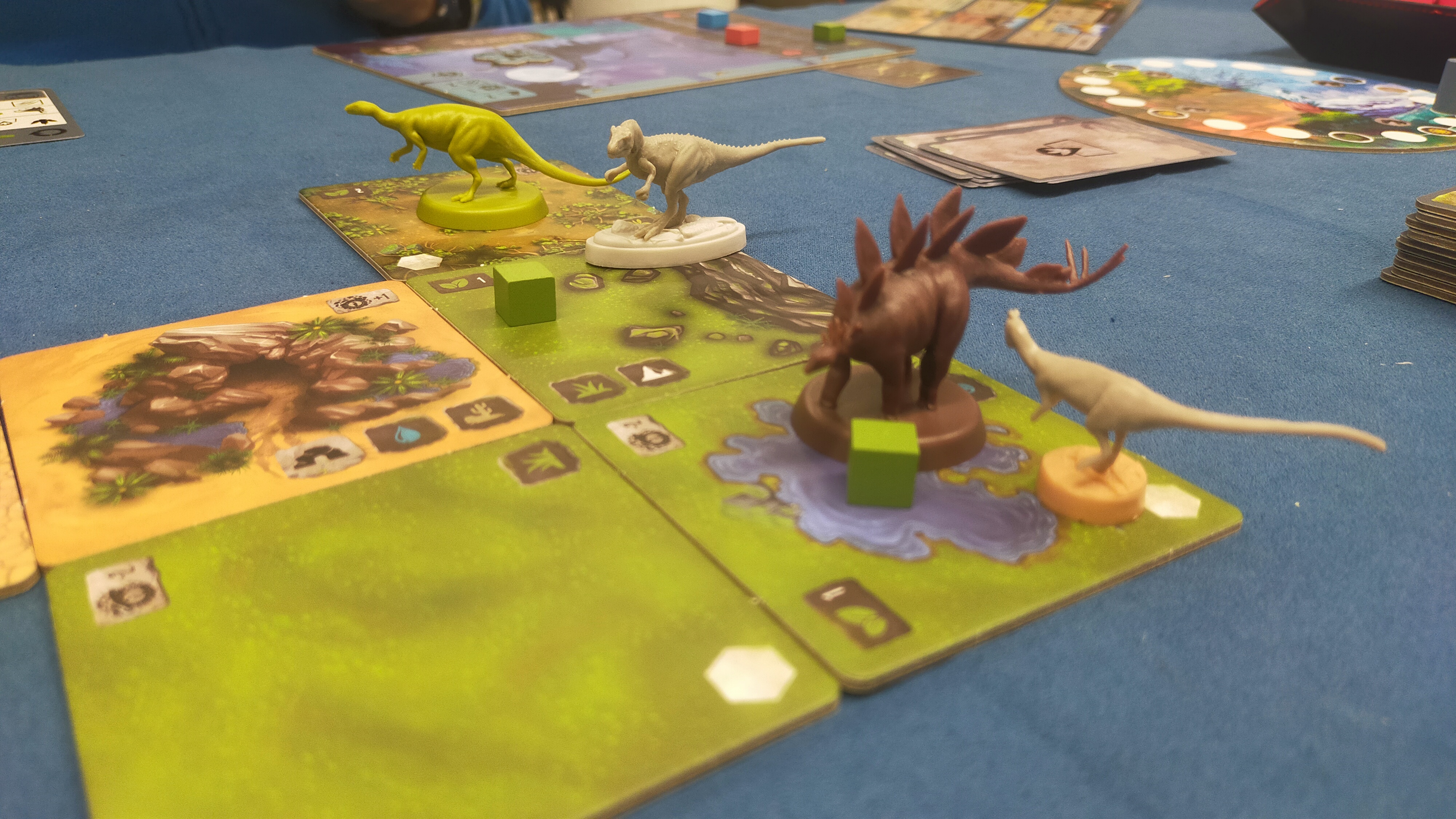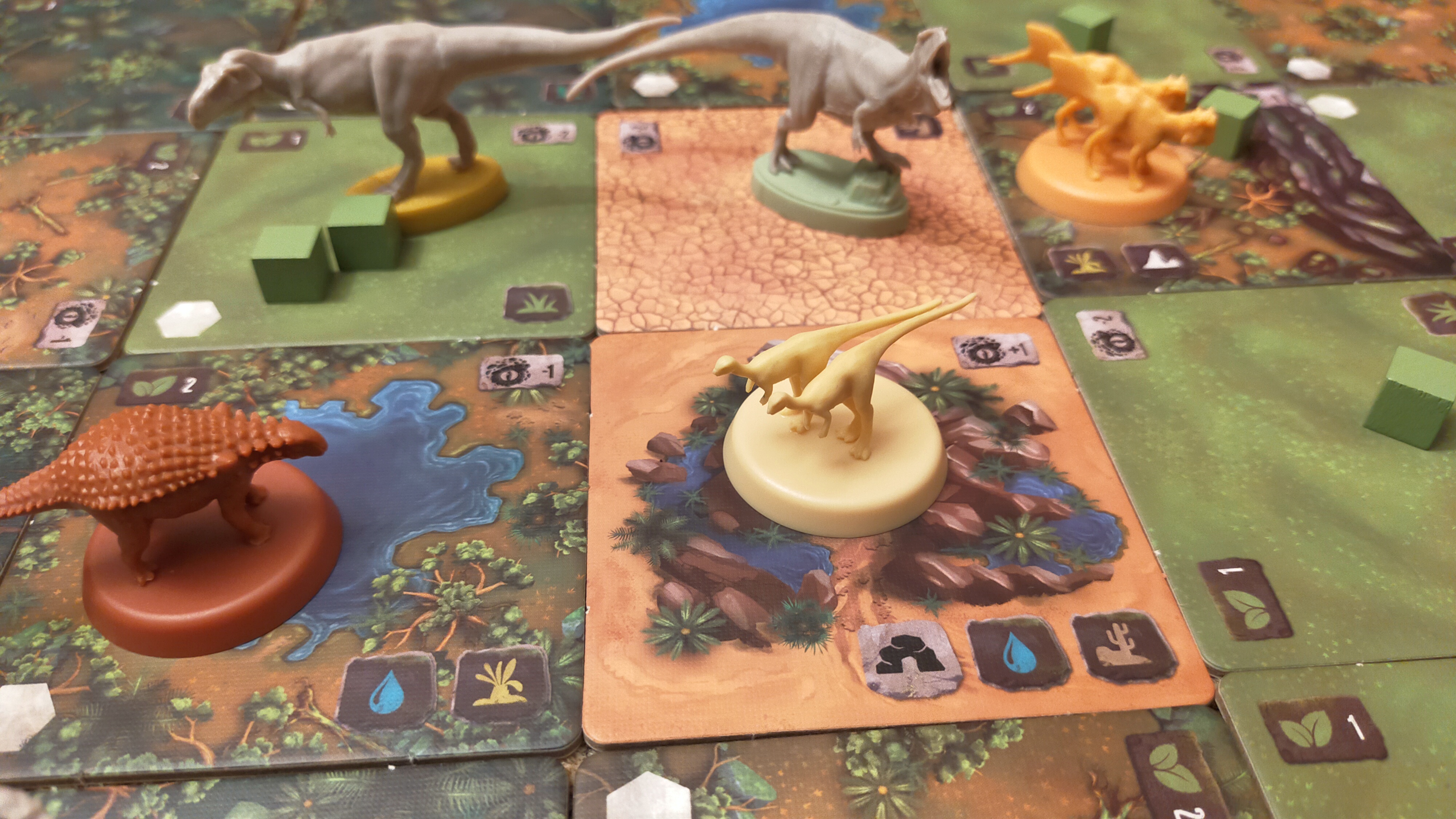 Destičky představují různé biotopy (s různým množstvím potravy) – lesy (3), křoviny (2), travnaté pláně (1) či pouště (0). Pokud herbivor stojí na políčku s kostkami potravy, může se nasytit a posunout ukazatel hladu nahoru o odpovídající množství potravy (ano, to názvosloví je trochu krkolomné).