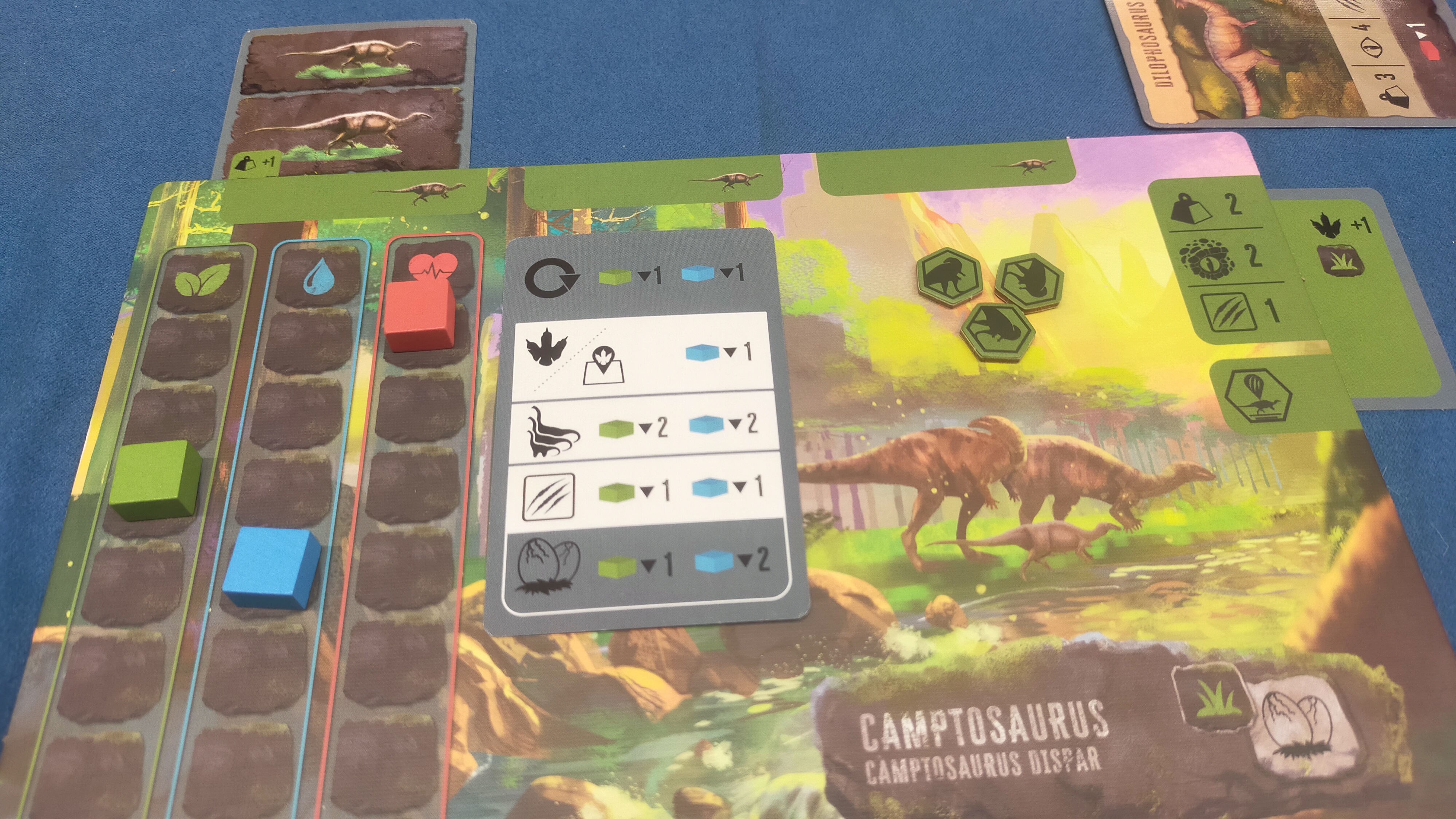 Každý hráč ovládá jeden druh býložravého ještěra, z nichž každý má jedinečnou schopnost. Na jeho desce sleduje čtyři ukazatele – hlad, žízeň, vitalitu a hnízdění – které se neustále mění podle dění na hracím plánu.