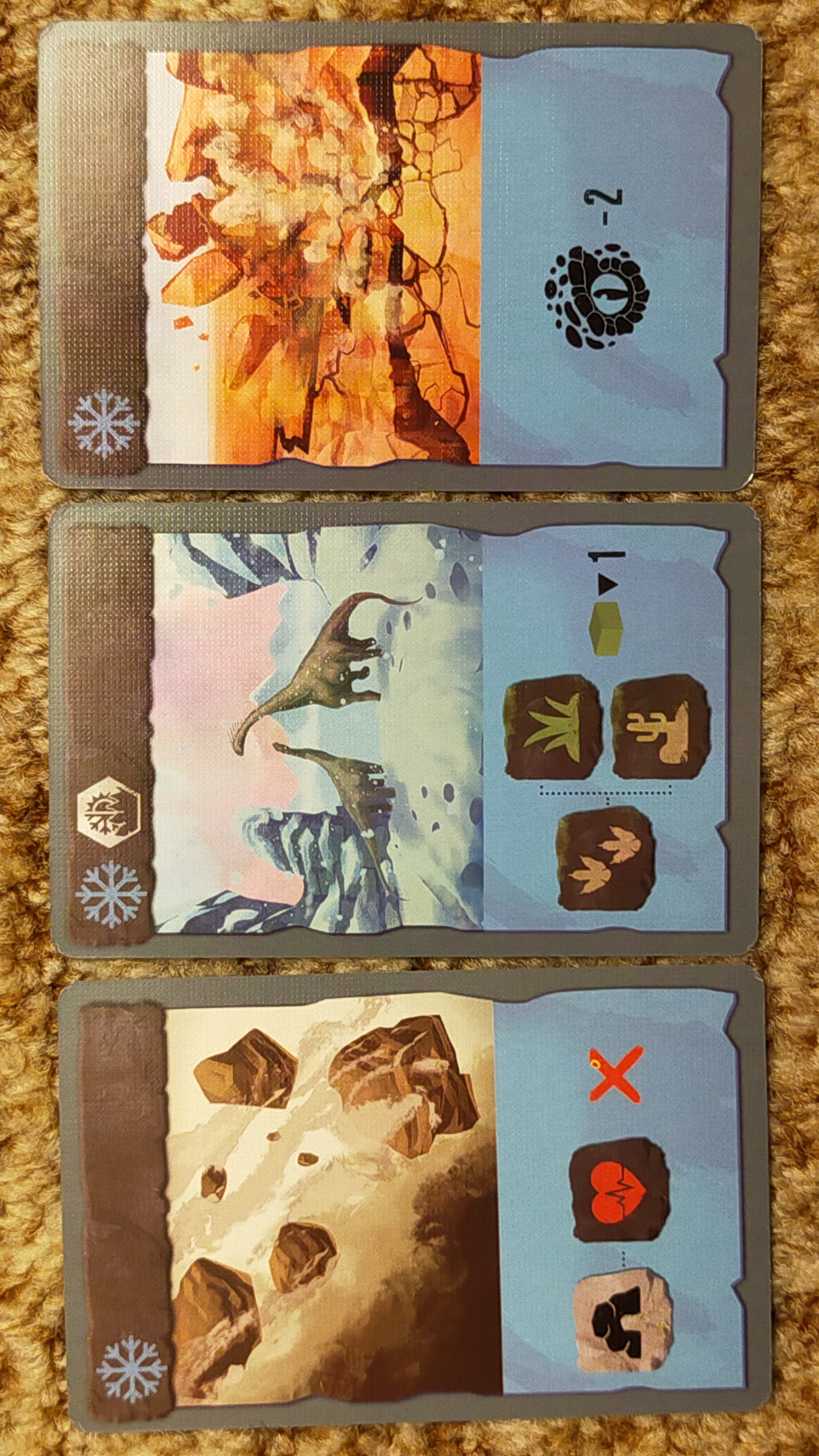 Je také matoucí vyhodnocování první kamufláže, byť je to logické, protože první údaj na ještěrech je hmotnost. A v neposlední řadě jeden odstavec lovu karnivorů je přeložený nejasně a chybně, zatímco anglický originál je pouze méně nejasný, ale stále ne exaktní. Přesto jsme si hru užili i v sestavě zkušených hráčů poté, co jsme si to museli sami nastavit. Kam až karnivoři dohlédnou je po pozorném přečtení jasné, ale ani tento autorův postup není intuitivní a v hrách obvyklý.