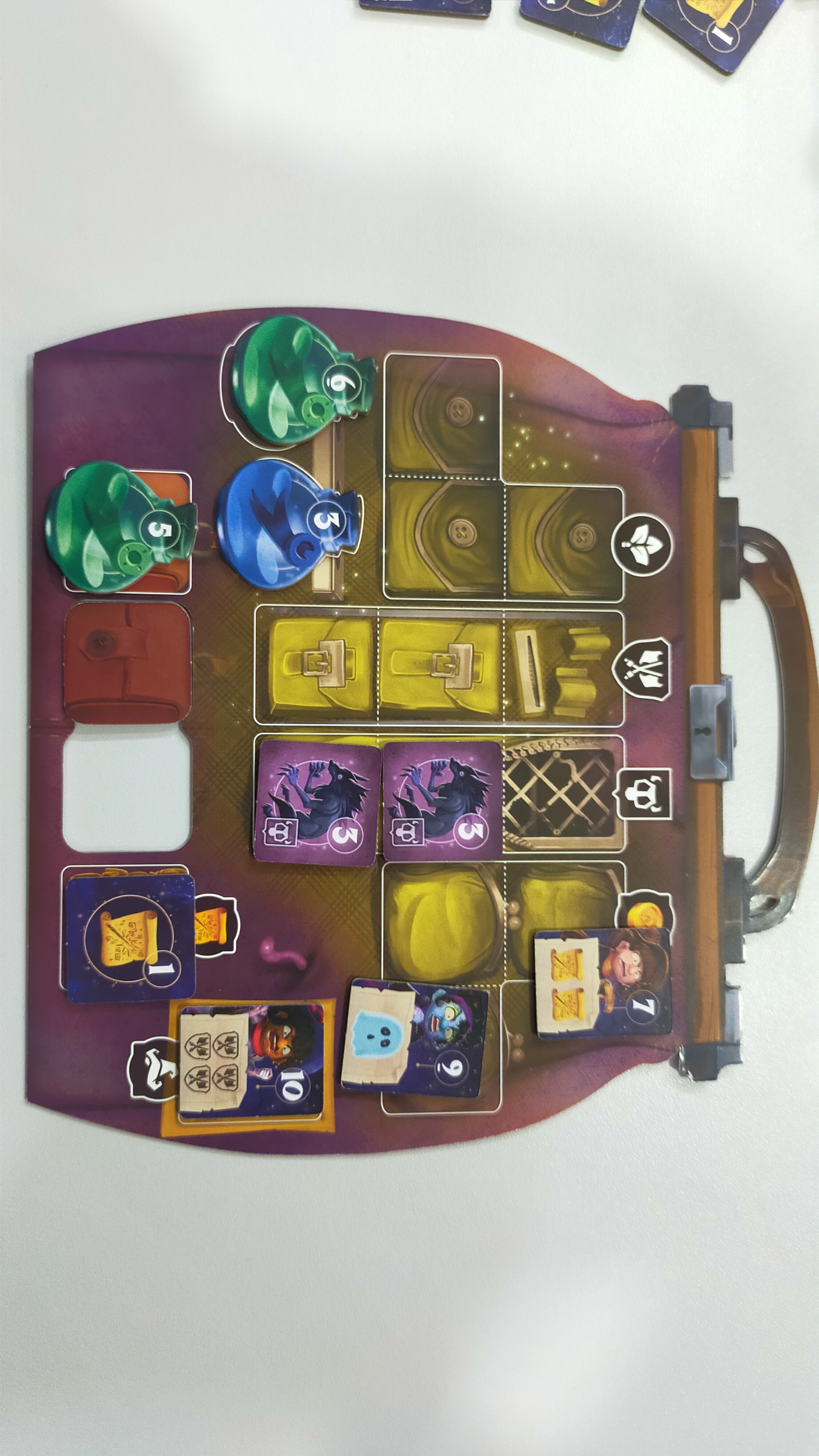 Získané žetony ukládáte do svého kufru podle typu. Každý kufr má přesně vyznačená pole pro zbraně, příšery, kouzla, lektvary i speciální žetony, takže musíte pečlivě zvažovat, co si necháte a co odhodíte do vodního příkopu kolem věže. Omezený prostor vám nedovolí hromadit všechno, co se vám líbí. A kdyby se vám zachtělo víc místa, musíte si díky svitku dobrat z bonusové nabídky moudrosti jednu či dvě brašny, kdy každá pojme jeden další předmět.