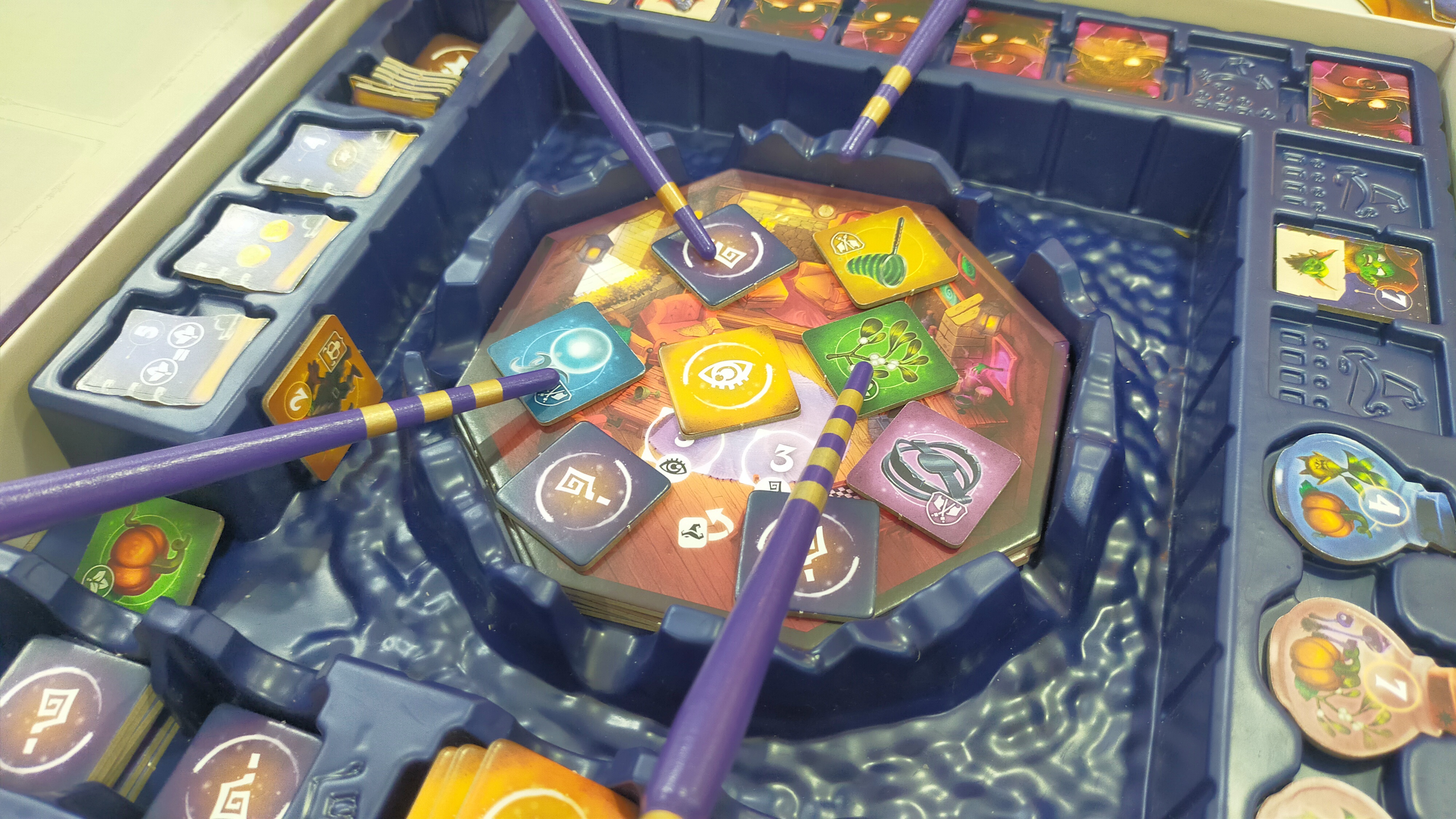 Když ukážete na různé žetony, každý si vezmete ten svůj. Pokud se sejdete u stejného, rozhodne síla hůlek – vítěz získá žeton, ale zároveň musí svou nejsilnější hůlku odevzdat hráči s nejslabší, který se sporu zúčastnil. Síla hůlek se tak v průběhu hry neustále přelévá mezi hráči.