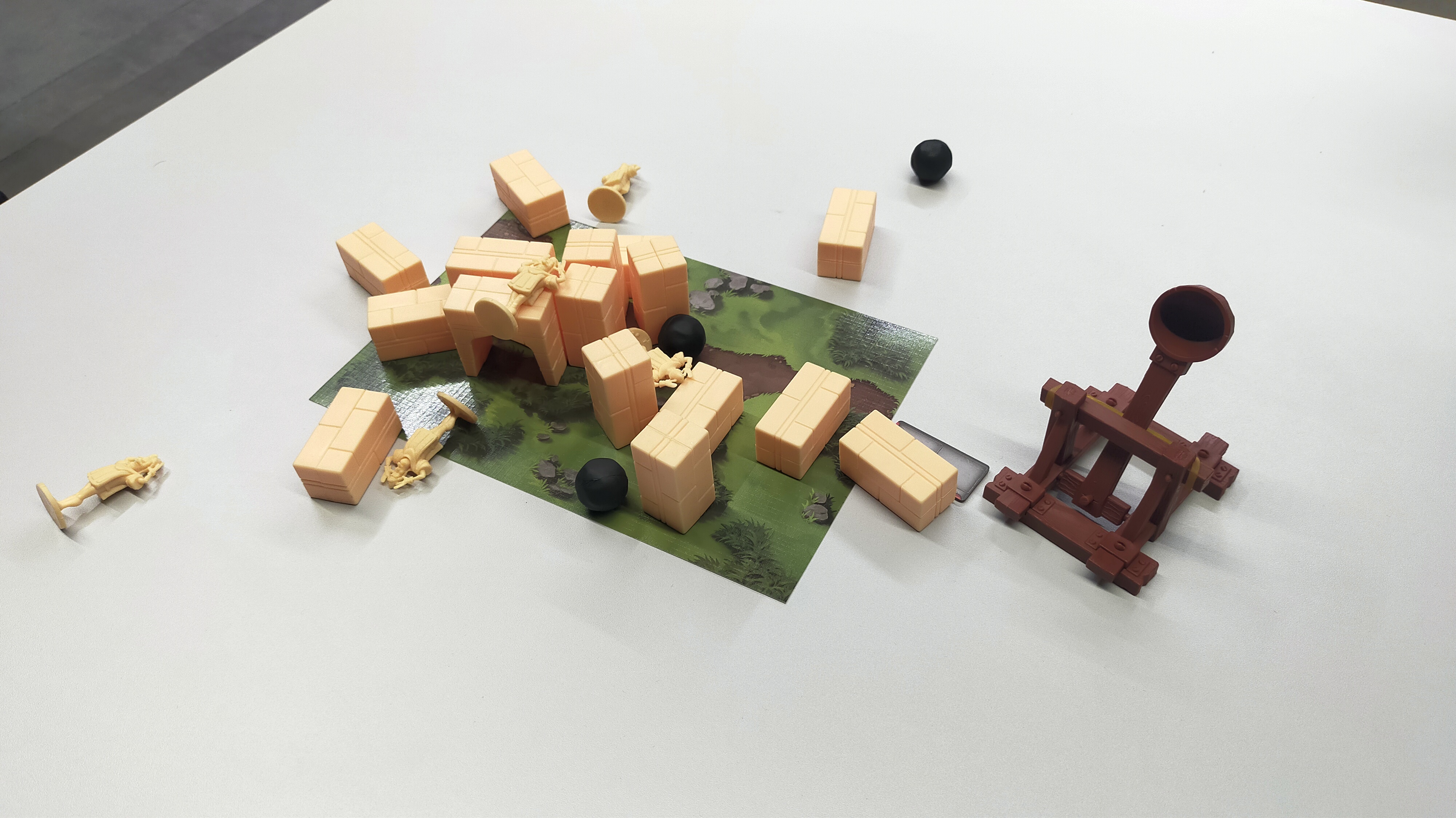 Cihly při stavbě musíte využít všechny a položit je tak, aby nikde nepřečnívaly z desky – můžete je libovolně vrstvit, pokud leží naplocho. Jakmile je váš hrad hotový, postavte ho ve vzdálenosti jeden a půl metru od toho soupeřova. Poté umístíte katapult k okraji desky tak, aby nepřesáhl stanovenou maximální vzdálenost.