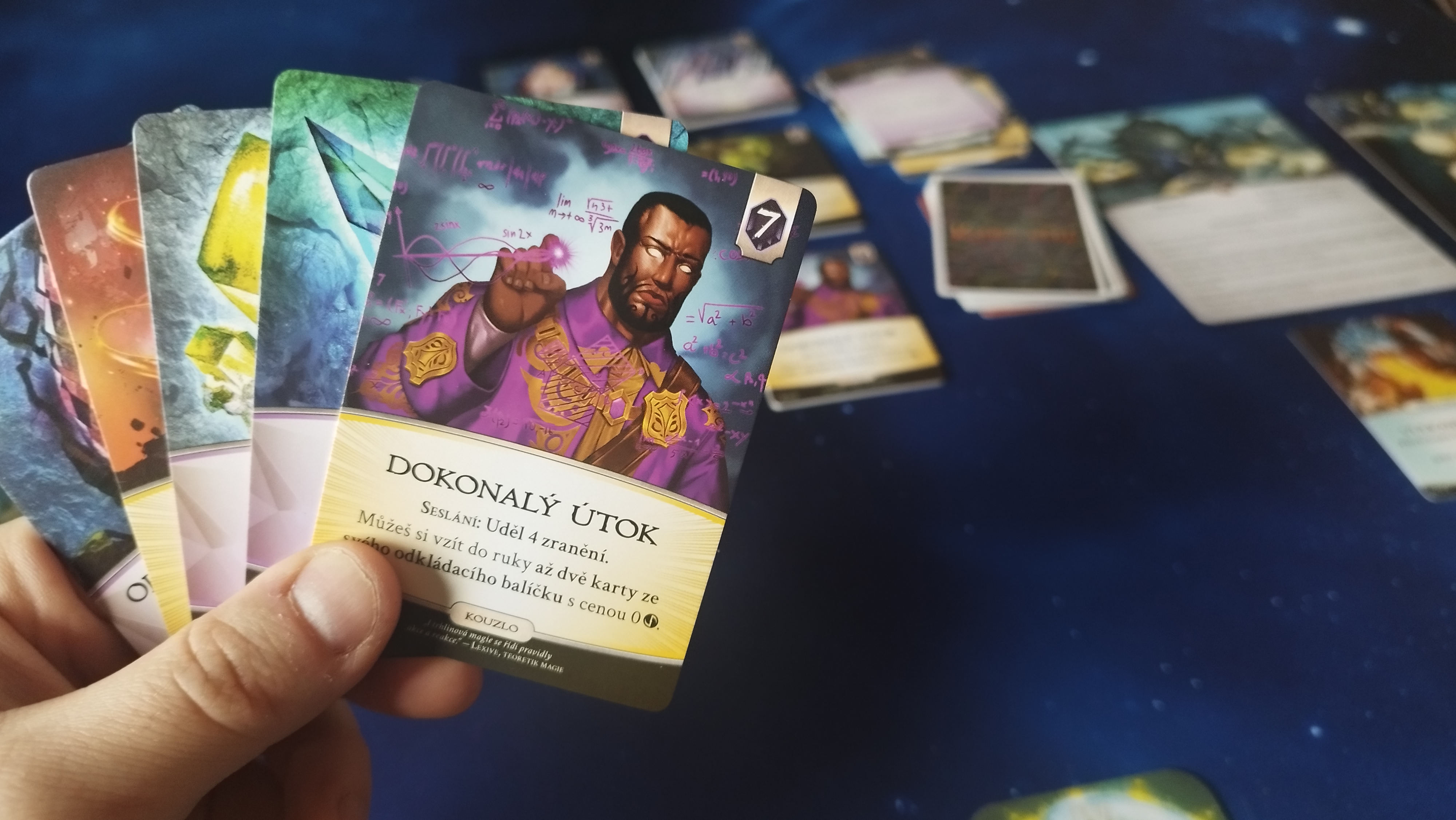 Přímo ve hře následně operujete s pěti kartami na ruce, které kromě kouzel, jež jsou primárním způsobem udělování poškození vybranému sokovi, obsahují i drahokamy a artefakty. Skrze drahokamy získáváte éter fungující jako hlavní platidlo, jímž otevíráte zmíněné trhliny, nabíjíte si schopnost, a hlavně nakupujete nové karty z tržiště v mřížce 3x3. Artefakty jsou zase takovými bonusy, jimiž upravíte trhlinu, případně získáte něco navíc.
