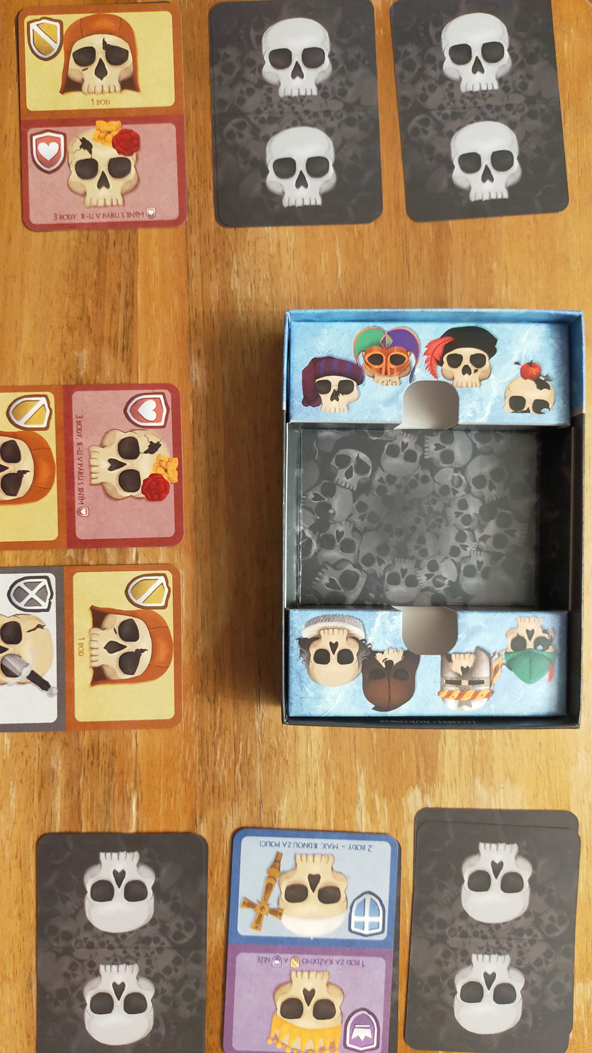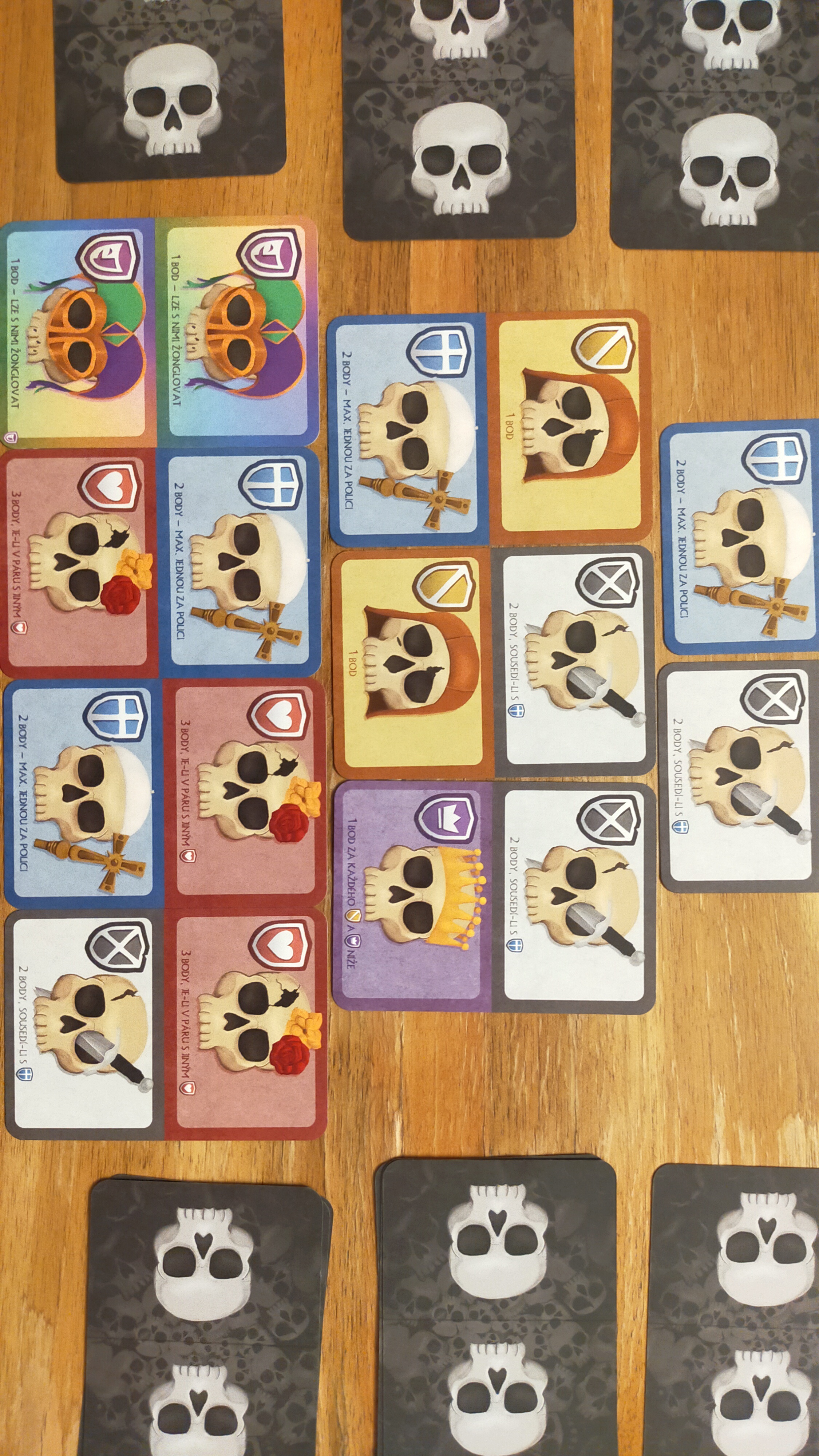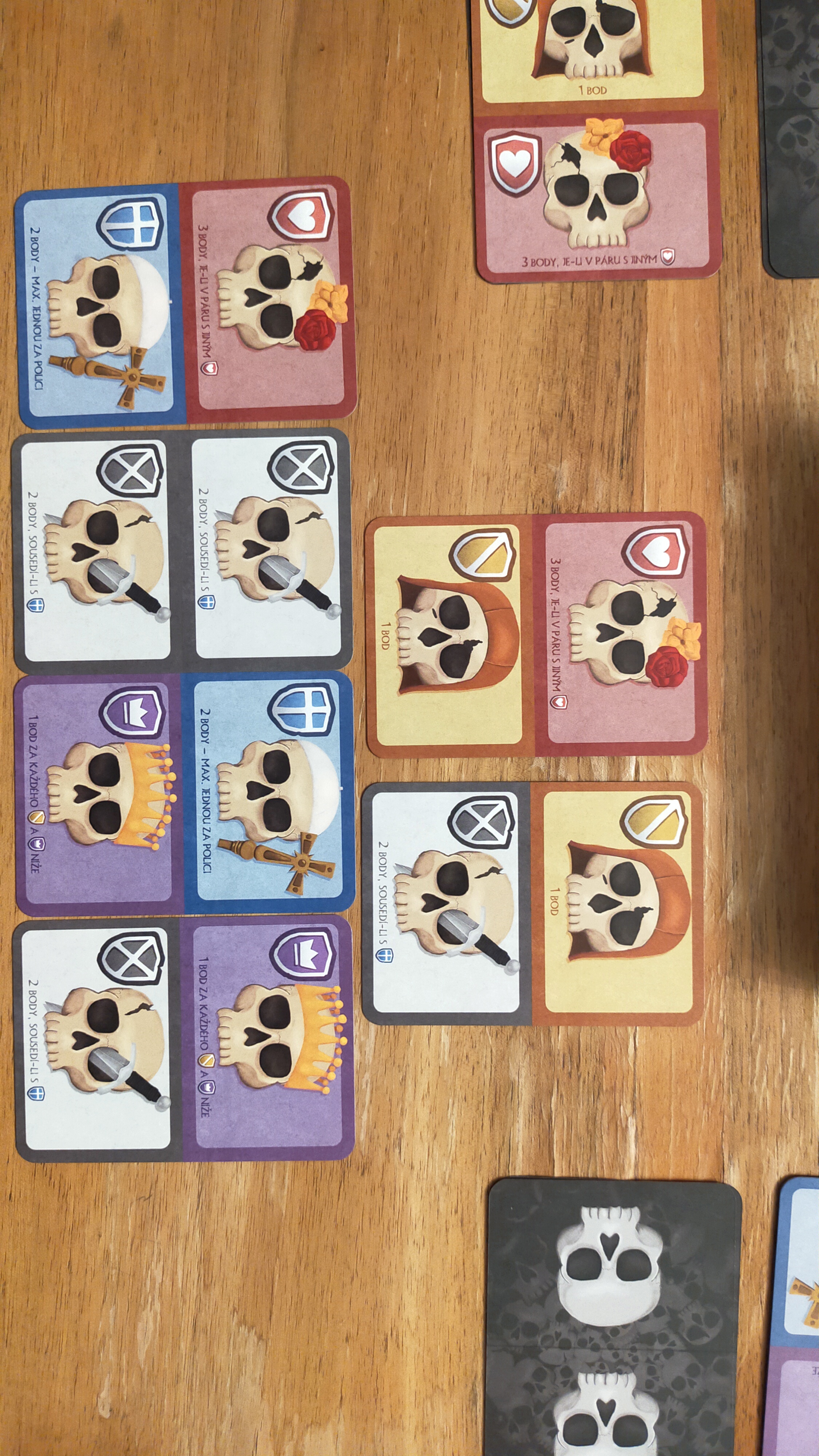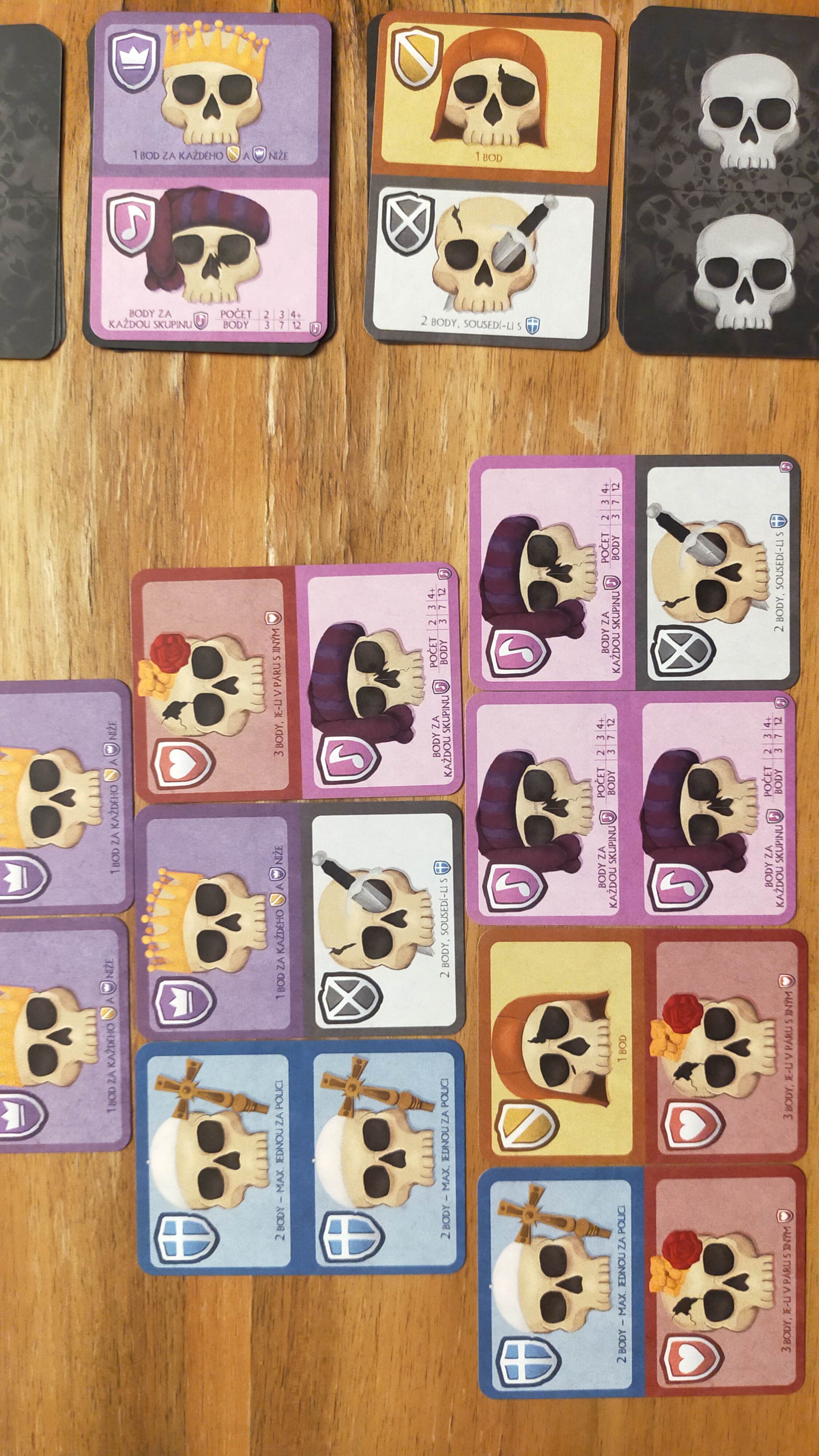 Když má každý hotovo, přichází na řadu závěrečné sčítání. Každý druh lebek má svůj způsob bodování, takže během partie přemýšlíte nejen o tom, jak kartu uložit, ale i o tom, jaké kombinace si připravíte do dalších tahů. Kartu tvoří dvě police a každá lebka dle původu chce ležet v konkrétní řadě, sousedit s konkrétní kartou, nebo se nalézat na konkrétním místě.