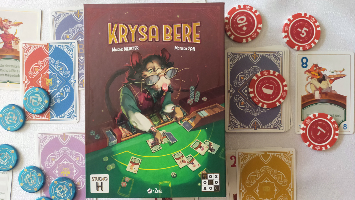 Než se ponoříme do samotných pravidel, rád bych zmínil, že Krysa bere oko estéta potěší. Nemluvím nyní o ilustracích, nýbrž o několikavrstvém potisku krabičky se šuplíkem, který skrývá s kartami i čtyři krabičky na jednotlivé balíčky, velké červené pokerové čipy a modré žetony bodů. Přestože čipy i body jsou plastové, vypadají opravdu pěkně a váhově nešizeně. Dojem luxusního kasina ale podtrhuje zlatý tisk na rubu i líci karet se vzorcem na krabičkách.