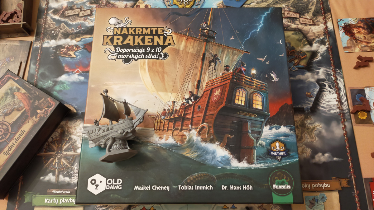 Autory jsou Maikel Cheney, Dr. Hans Joachim Höh a Tobias Immich, grafiku obstarali James Churchill a Hendrik Noack. V češtině jsme se dočkali sice jen retailové verze bez figurky Krakena, jeho chapadel a žetonů rolí v drobných váčcích, ale nic z toho nemá na hraní vliv. A kdo by chtěl, může si u Old Dawga pořídit neoficiální deluxe upgrade z 3D tiskárny. Dost bylo formalit, je čas vyplout!