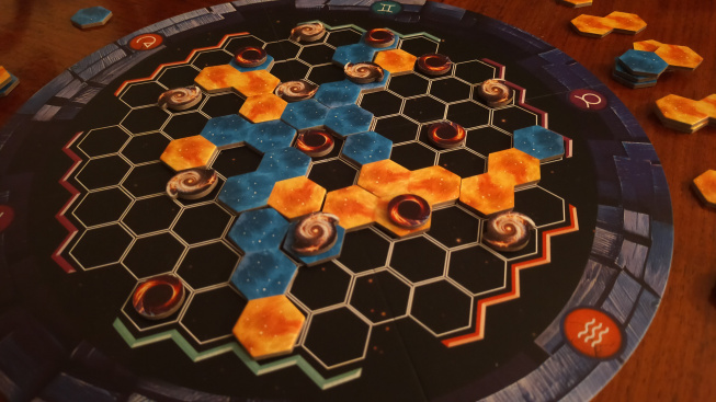 A právě v tom spočívá celá pointa. Dílky, jimiž hráči disponují, obsahují povětšinou i barvu soupeře. Jsou též přehledně před hráči vyskládané. Je snadné partii rozehrát, ale po pár tazích víte, že musíte plánovat několik tahů dopředu. A jak se plocha zaplňuje, tedy roste vaše i soupeřova síť hexů, dojde vám, že jste měli přemýšlet už od mezigalaktického vykopnutí. Žetony černých děr a galaxií jsou na každém kroku, čímž vás pravidla nutí používat destičky, které použít nechcete či jinak, než jste původně zamýšleli. Blokujete soupeře na jedné straně, ale zároveň mu dost možná pomáháte stavět paralelní cestu.