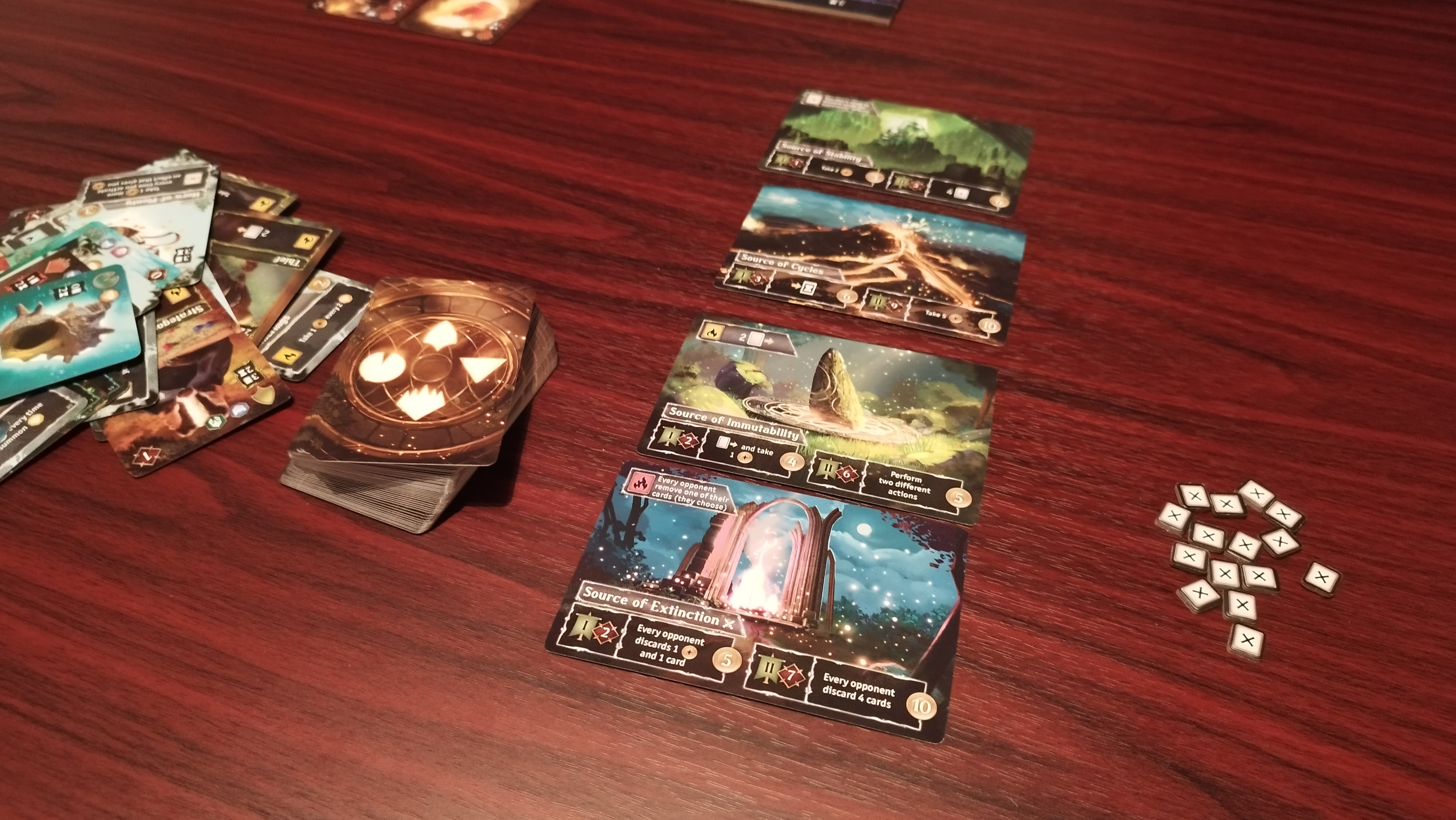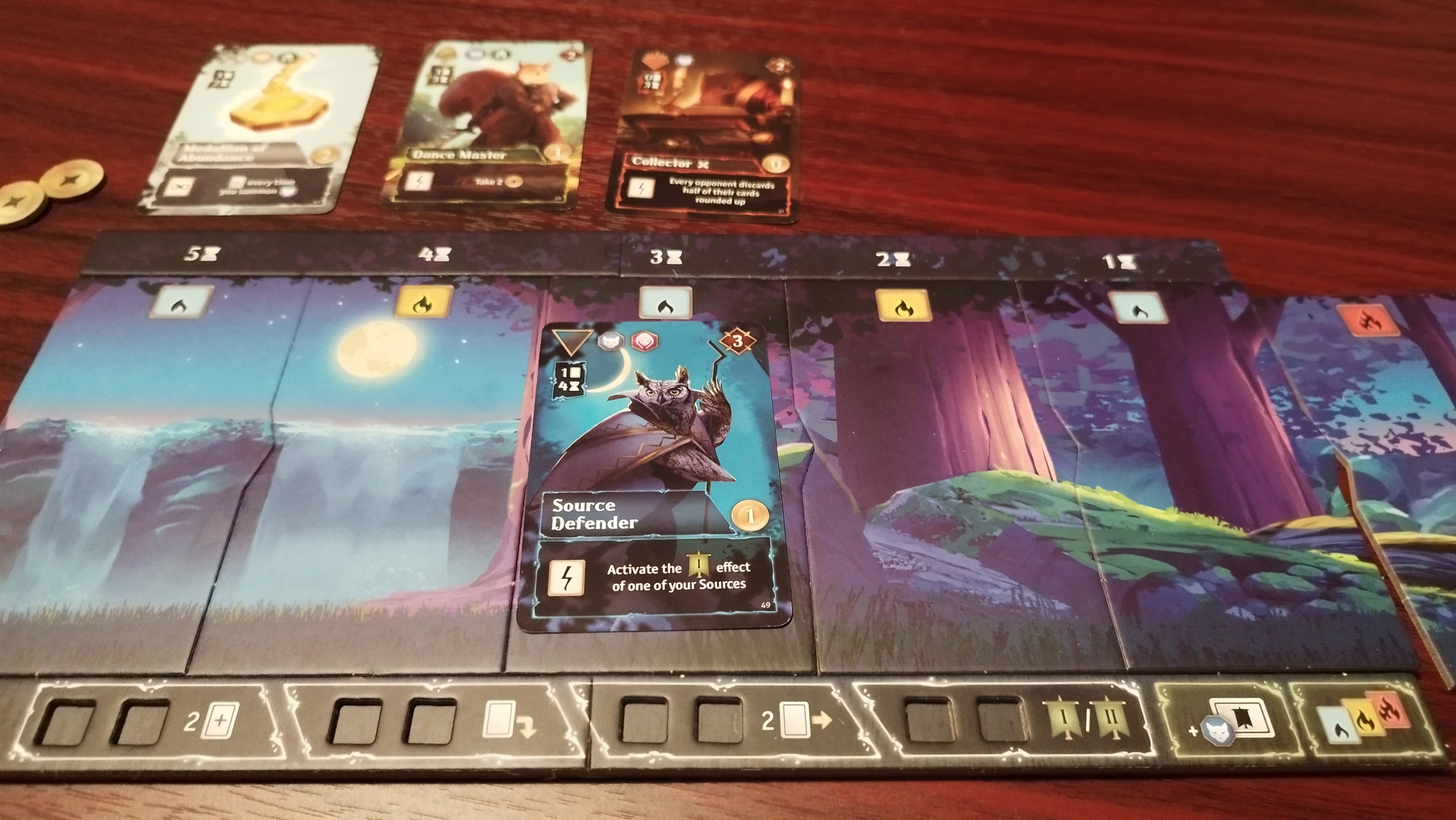 Dalším je dobývání a opevňování karet zdrojů/lokací, což je poslední možná akce. U nich musíte překonat předepsanou sílu útokem s vybraným počtem bytostí, abyste je mohli získat do svého hájemství. Jakmile se to povede, aktivujete speciální efekt a když ve vašem vlastnictví zůstanou do konce, získáte za ně i vyobrazené body. Zároveň ale musíte počítat s tím, že použité bytosti na dobytí/opevnění přijdou o své schopnosti, minimálně do doby, než vám zdroj někdo sebere.