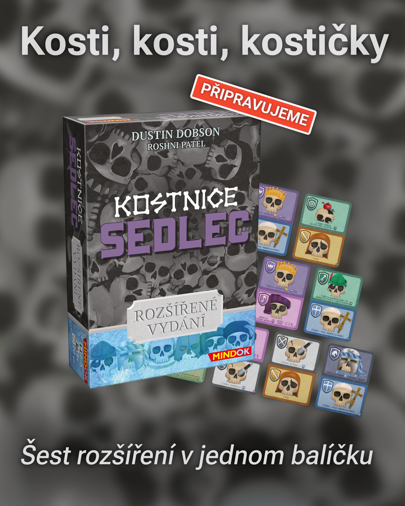 - Společně s tím firma udělala radost všem příznivcům Kutné Hory. Ne, nejde o pokračování skvělé eurovky, nýbrž se chystá rozšířené vydání Kostnice Sedlec. Kromě základu nabízí 6 rozšíření po 6 kartách a jedno menší. Takže vaše sezení budou ještě bohatší. A to nejlepší? Novinka vyjde ještě letos!