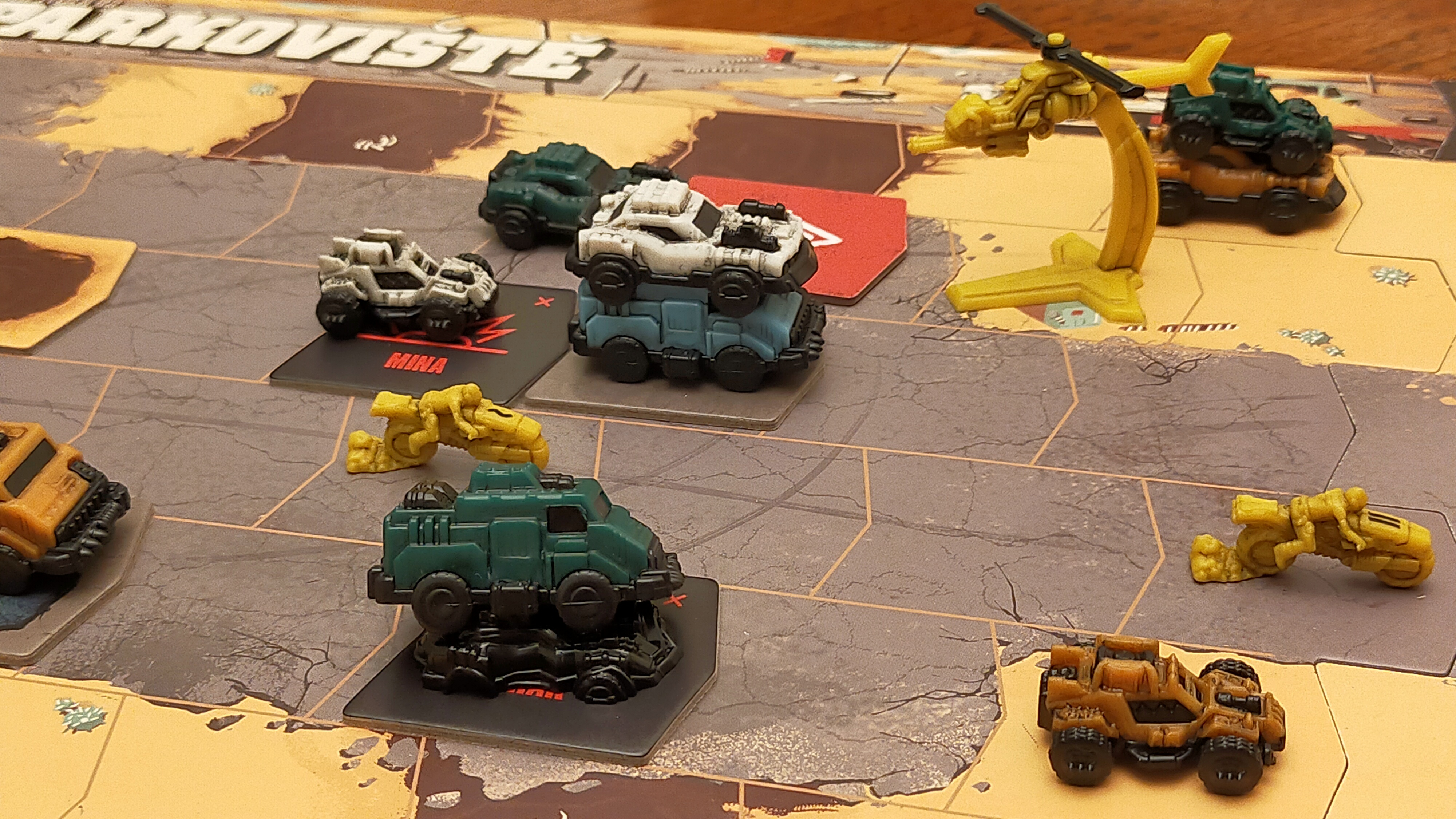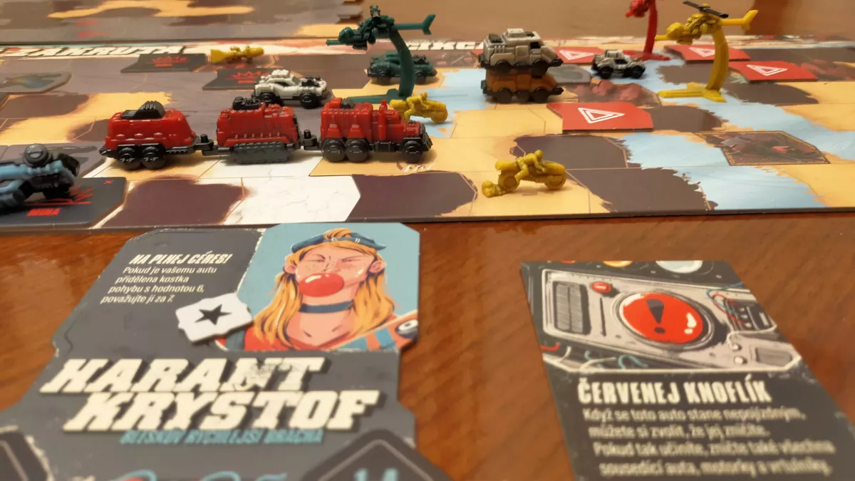 Samotného velitele si na začátku vyberete ze dvou rozdaných karet. Netýká se to však majitelů Drobečka a Poslední pětky. Karty vylepšení naopak rozhodíte draftem, kdy každý hráč začíná se čtyřma. Jednu si ponechá a zbylé pošle dál. Jakmile je nadraftováno, ke každému vozu si hráči přidělí po jedné vybrané kartě. Od té chvíle mají vaše vozy přístup k novým schopnostem – třeba přehodit kostku střelby, pokládat miny nebo vytvářet olejové skvrny na silnici, které soupeřům přidělají vrásky s monoklem.