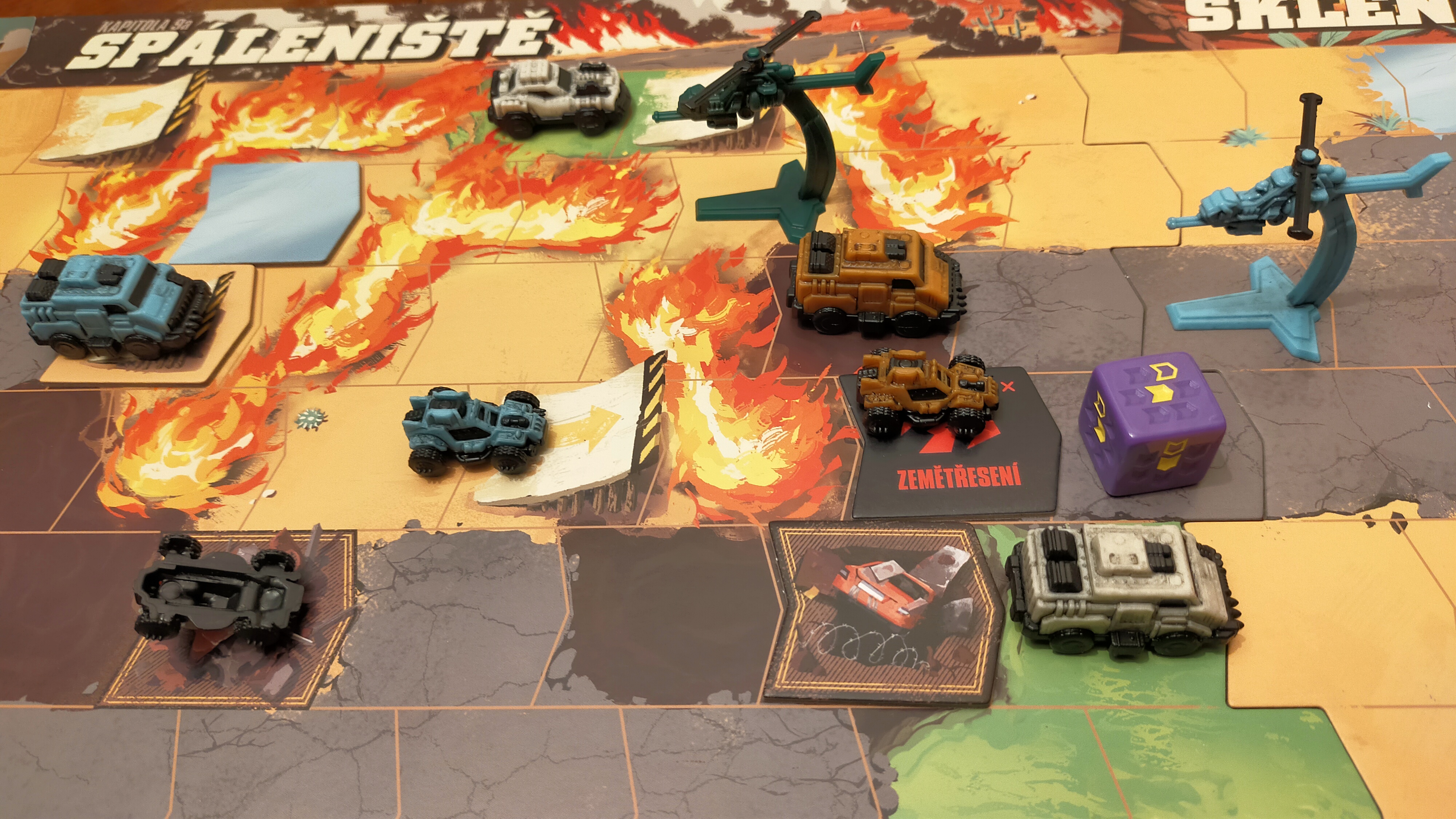 Co za nové nástrahy na vás čeká? Zemětřesení rozhýbe všechna auta najednou v jednom náhodném směru. Obří písečný červ dokáže okamžitě sežrat vozidlo, které je na trati nejvíce vzadu, a pokud tam náhodou stojí víc strojů, pochutná si na prorezlém menu. Jiné hrozby zůstávají na plánu trvale — pole pouštního skla vás pošle o jedno políčko dopředu bez utracení pohybu, rampa umožňuje filmový skok řízený kaskadérskou kostkou, ale pokud na ni nenajedete zpříma, přijdete o vozidlo nehodné akrobatických činů, a nový žeton ohně může zažehnout další požár přímo pod koly vašeho vozu.