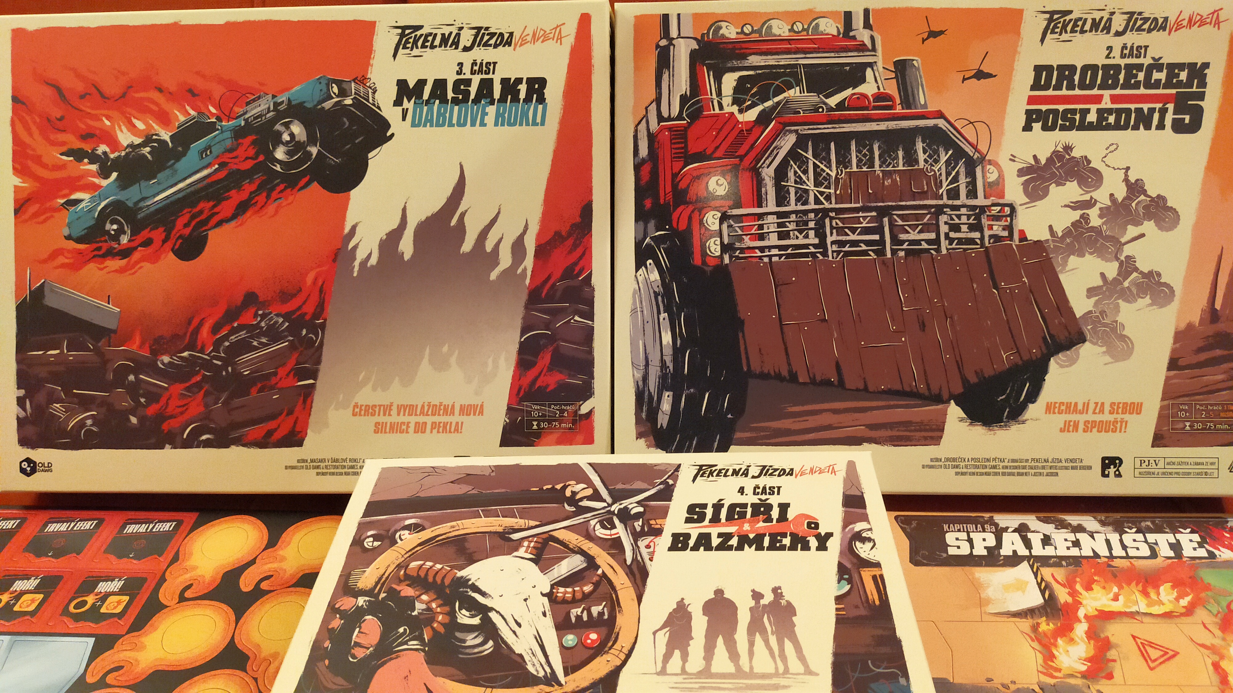 Dnes se podíváme na tři velká rozšíření Drobeček a Poslední pětka, Masakr v Ďáblově rokli a Sígři & Bazmeky pro postapokalyptický závod ve hře Pekelná jízda: Vendeta, která je remakem klasické stolní hry z roku 1986. Novou verzi pro 2 až 4 hráče v češtině vydalo vydavatelství Old Dawg a hodnocení základní hry si můžete přečíst v naší recenzi.
