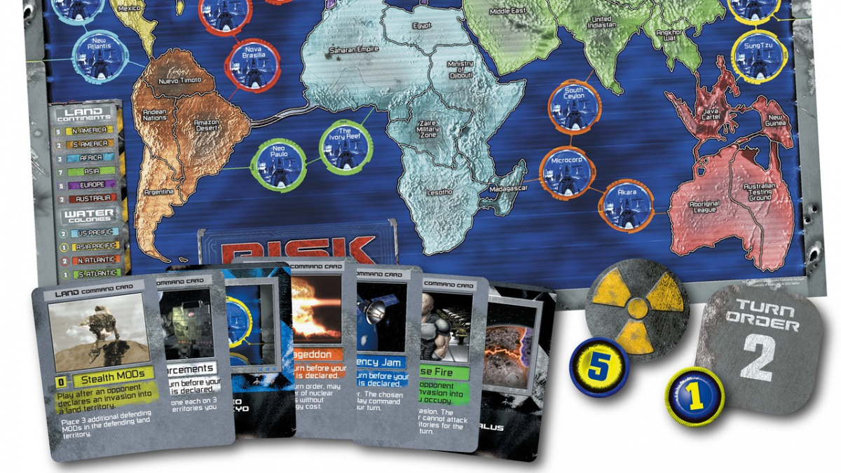Risk je přístupná válečná hra, v níž se každá armáda roztahuje po mapě světa (v tomto případě je k dispozici i Měsíc, a na mapě světa jsou dokonce podmořské lokace), hojně se v ní hrají karty a do výsledku jednotlivých bitev promlouvají kostky.