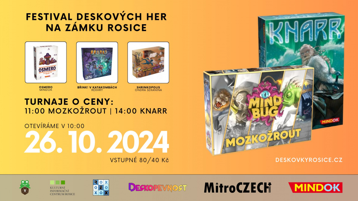 Deskoherní klub Rosnička vás všechny zve na již třetí festival v Rosicích. I tentokrát přijedou zástupci vydavatelů představit své deskoherní novinky, kde se můžete těšit například na Mindok se hrou Osmero nebo na nového hráče na českém trhu: Bohemian Games. A nebudou chybět ani deskoherní autoři a jejich čerstvé prototypy.