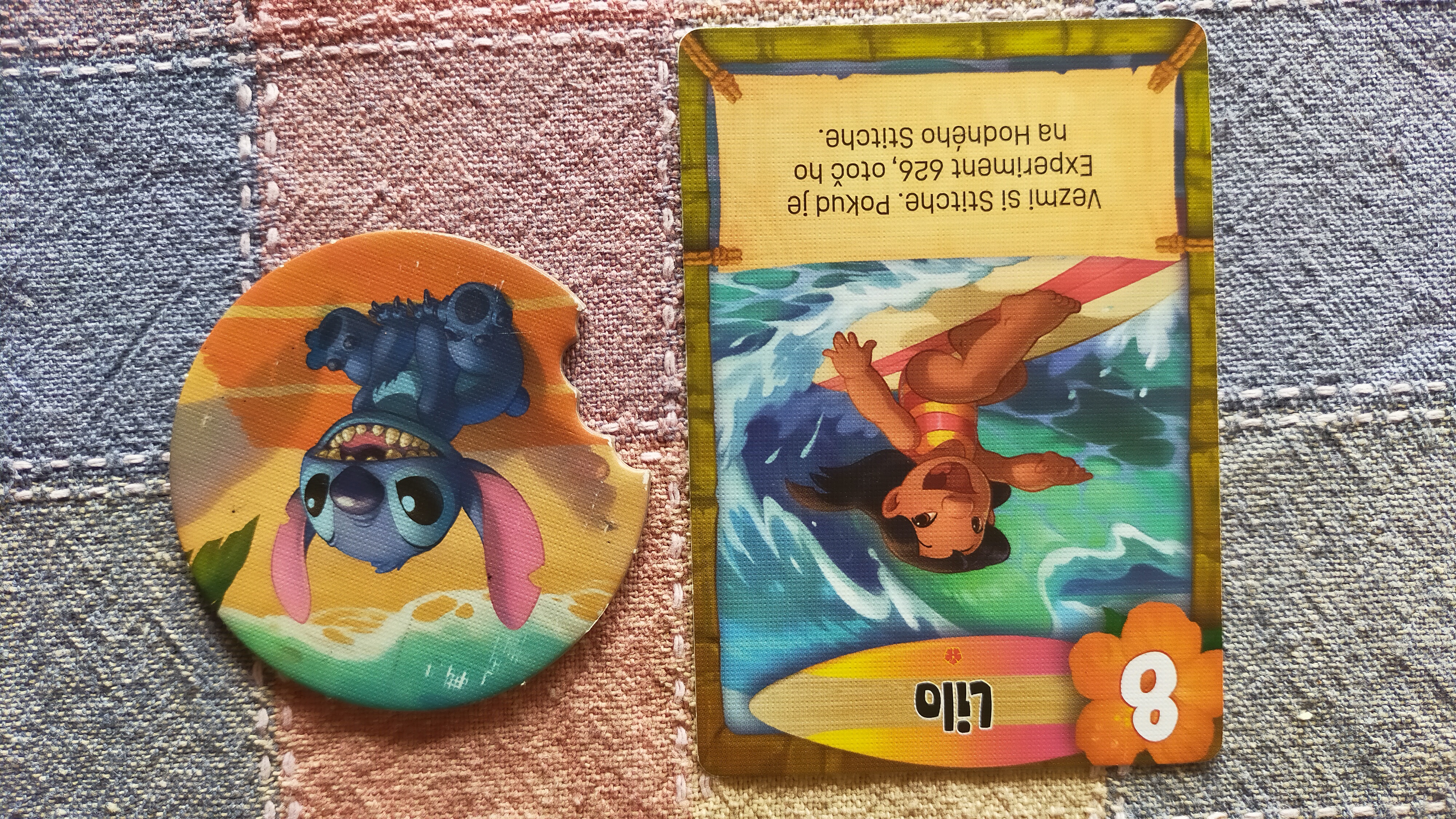 Pojďme si představit postavy a jejich hodnoty. Gantu (hodnota 0) pošle Stitche hráči po levici; Prezidentka Federace (1) umožní tipnout kartu v ruce jiného hráče – pokud je tip správný, hráč vypadává z kola. Na rozdíl od strážkyně z klasiky smí hádat i další prezidentku; Cobra Bubbles (2) vám dovolí podívat se na kartu jiného hráče, a pokud je to Lilo nebo Nani, tento hráč vypadává, tedy takový krutopřísnější kněz.