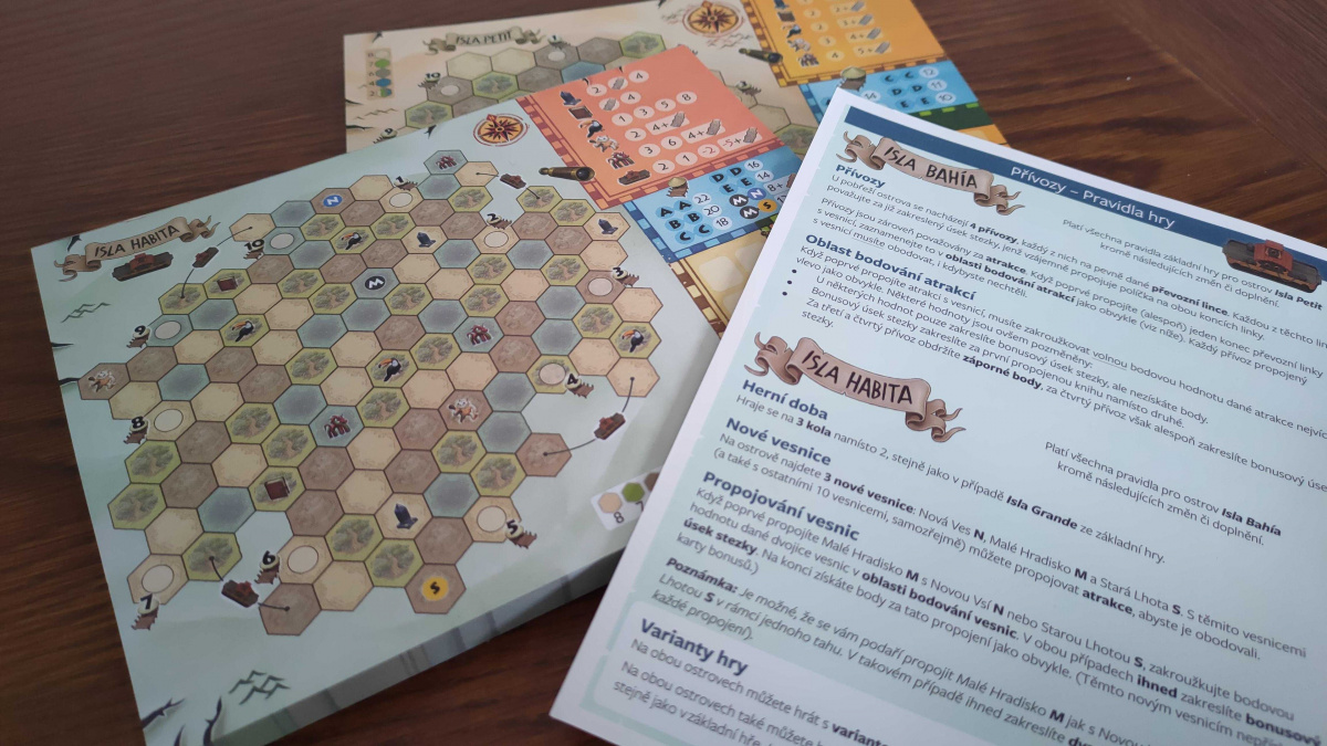 Ale teď už k samotným Přívozům. Jak už název napovídá, na dvojici nových map v novém stostránkovém bloku (opět z jedné strany menší mapa pro dvě kola hry a z druhé větší pro tři kola) uvidíte nově čtyři trajekty rozmístěné po okraji tajuplného ostrova, které už od prvního pohledu spojují dva přilehlé cípy pevniny.