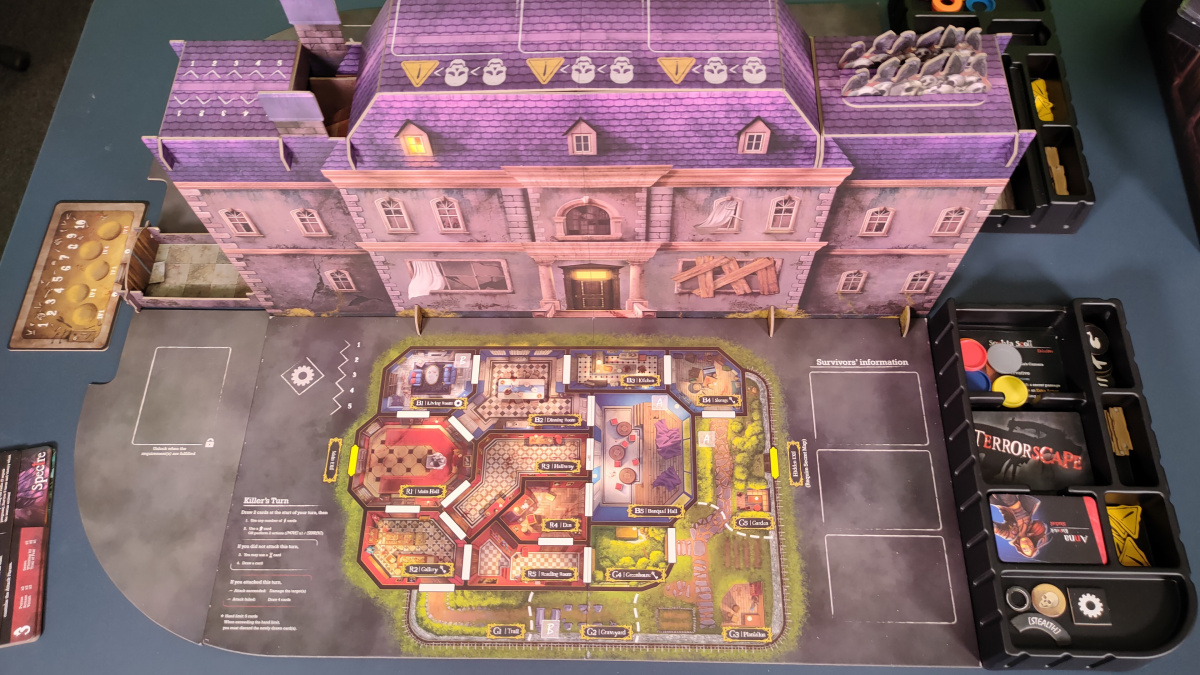 Jeho hlavním účelem totiž je oddělit vraha od ostatních hráčů a jedná se tedy o tematicky moc hezky zpracovanou zástěnu. Tvůrci se ale rozhodli využít její přítomnosti na maximum, takže na střeše budovy jsou karty se životy přeživších a jejich mírou strachu, což je informace dostupná všem hráčům.