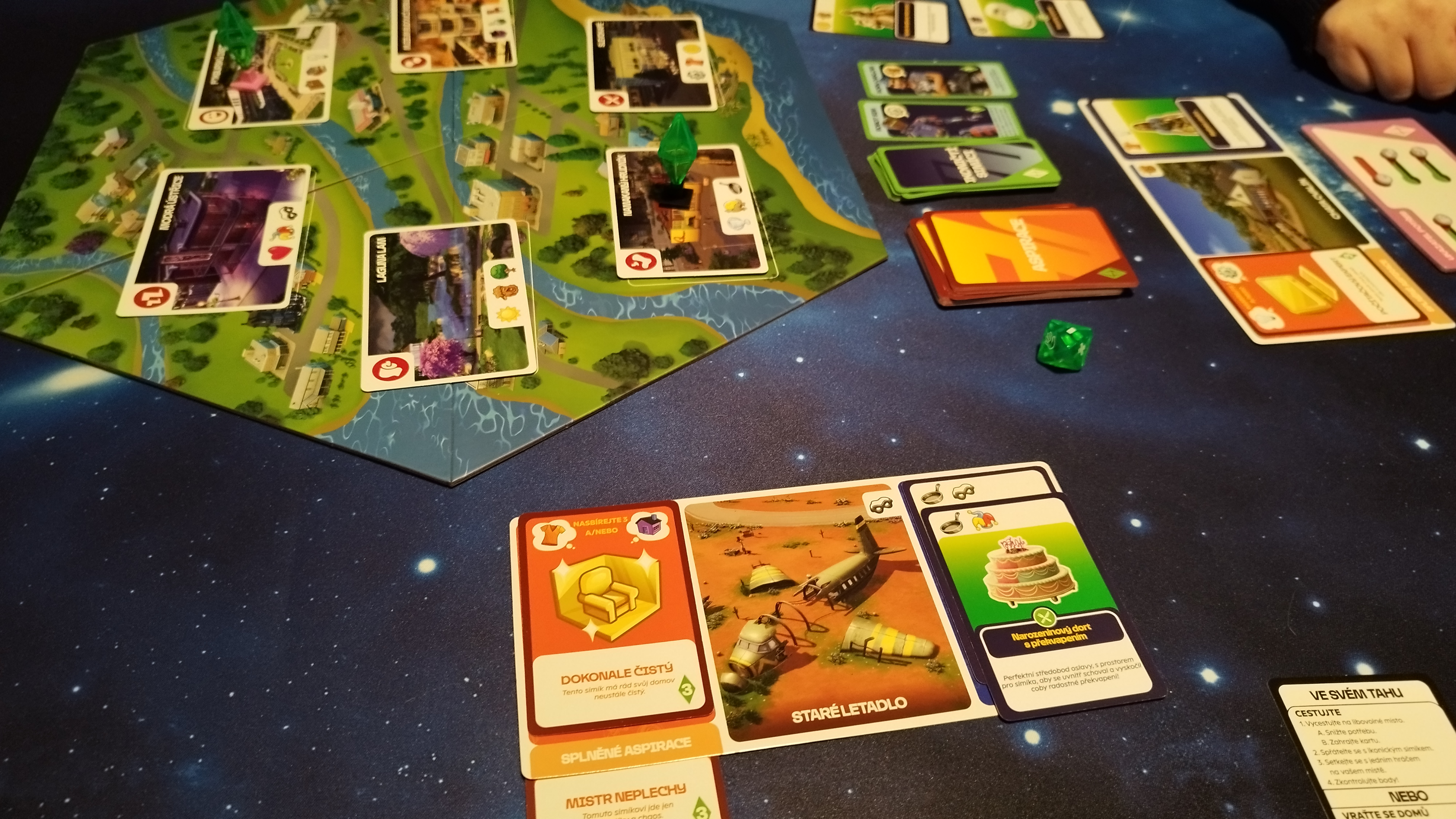 Styl všech komponent pracuje se známou barevnou paletou laděnou trochu do pastelu, lokací na kartách je hromada, výběr oblíbených postav je důkladný a figurky v podobě plastového plumbobu (ikonický šestiúhelníkový dvojjehlan) potěší. Stejně tak radost dělají ukazatele potřeb s dostatečně pevným posuvníkem, abyste s ním nechtě nehnuli. Vše bezpečné uložené do pořadače, do něhož všechno pohodlně vložíte.