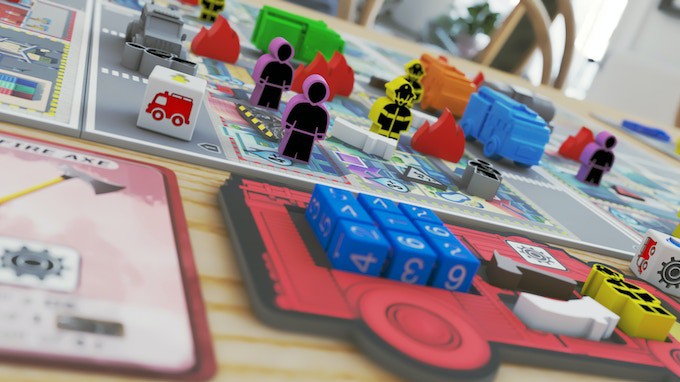 Každý z jednoho až čtyř hráčů (ano, můžete hrát sólo) tu není zastoupený hasičem, ale hasičským autem, které si ještě před výjezdem vybaví dvěma záchranáři, dvěma předměty (hadice nebo sekery) a cisternu naplní vodou, tedy modrými kostkami.