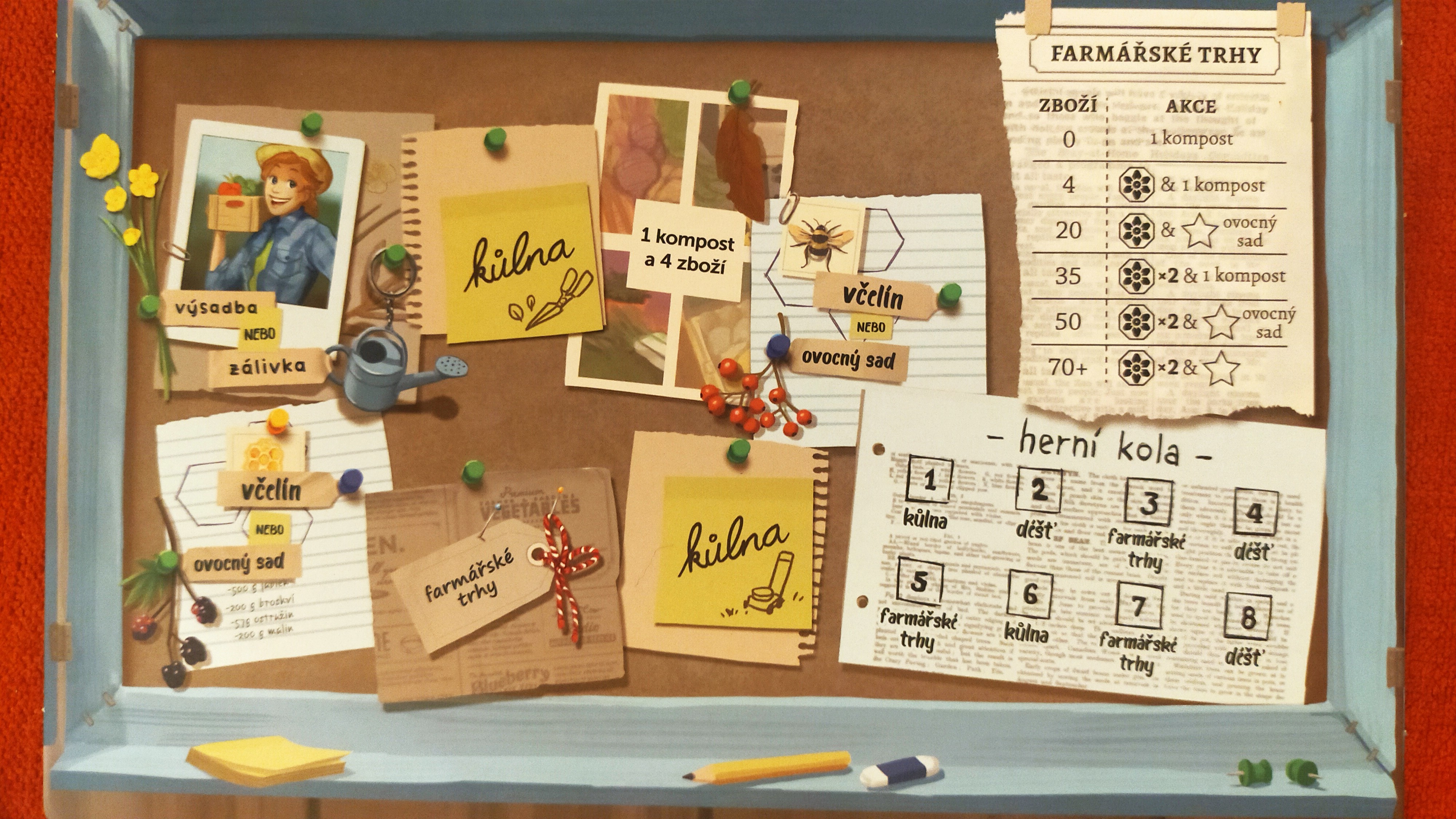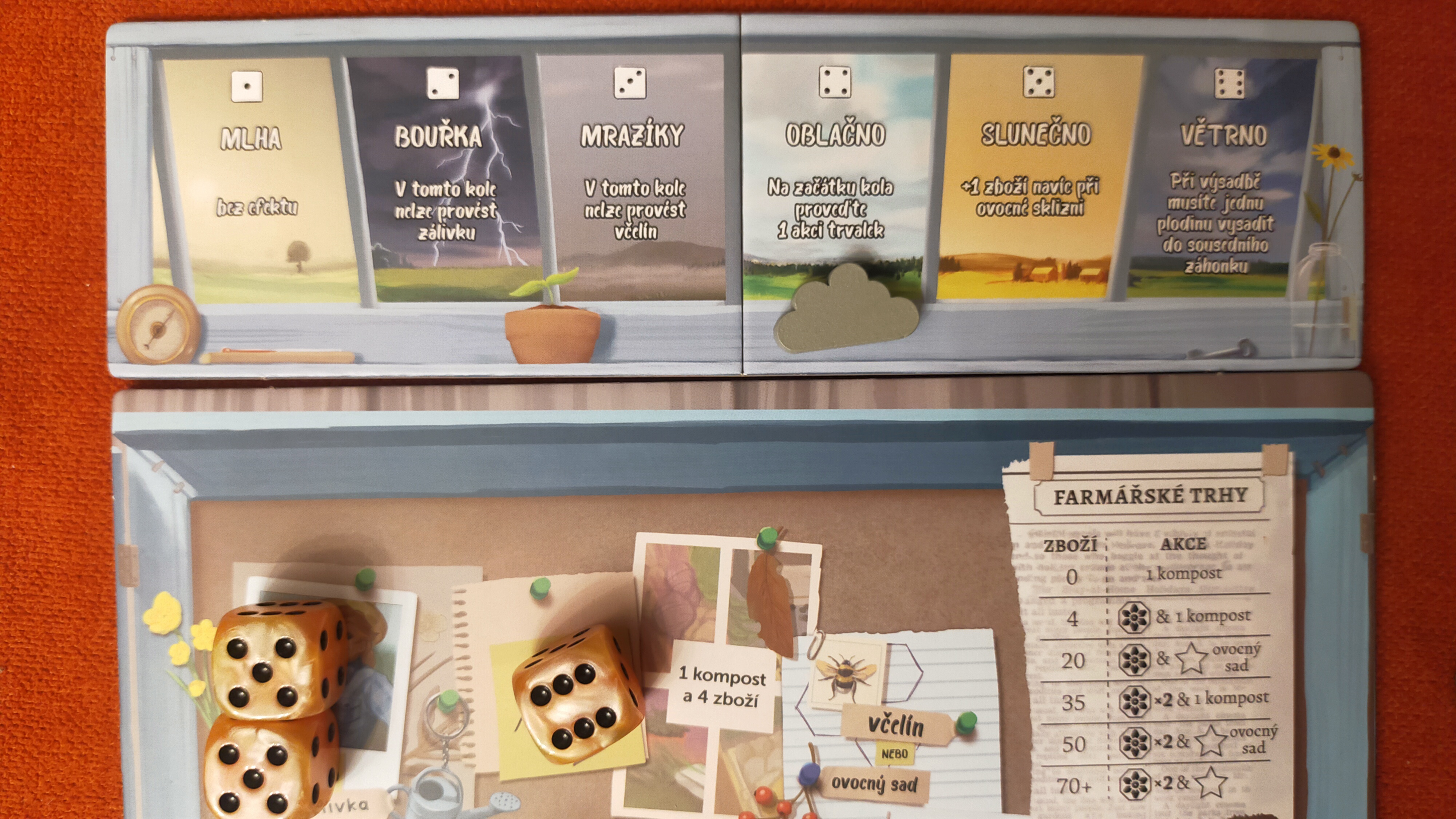 Čím více zboží máte, tím dosáhnete na silnější akci díky farmářským trhům. Obdobně funguje i pomalu se rozrůstající kompost, který si vždy značíte tečkou. Ve svém tahu pak můžete vyškrtnutím spotřebovat části svého kompostu a za každé políčko s tečkou upravit hodnotu kostky na rondelu o +1 či -1.