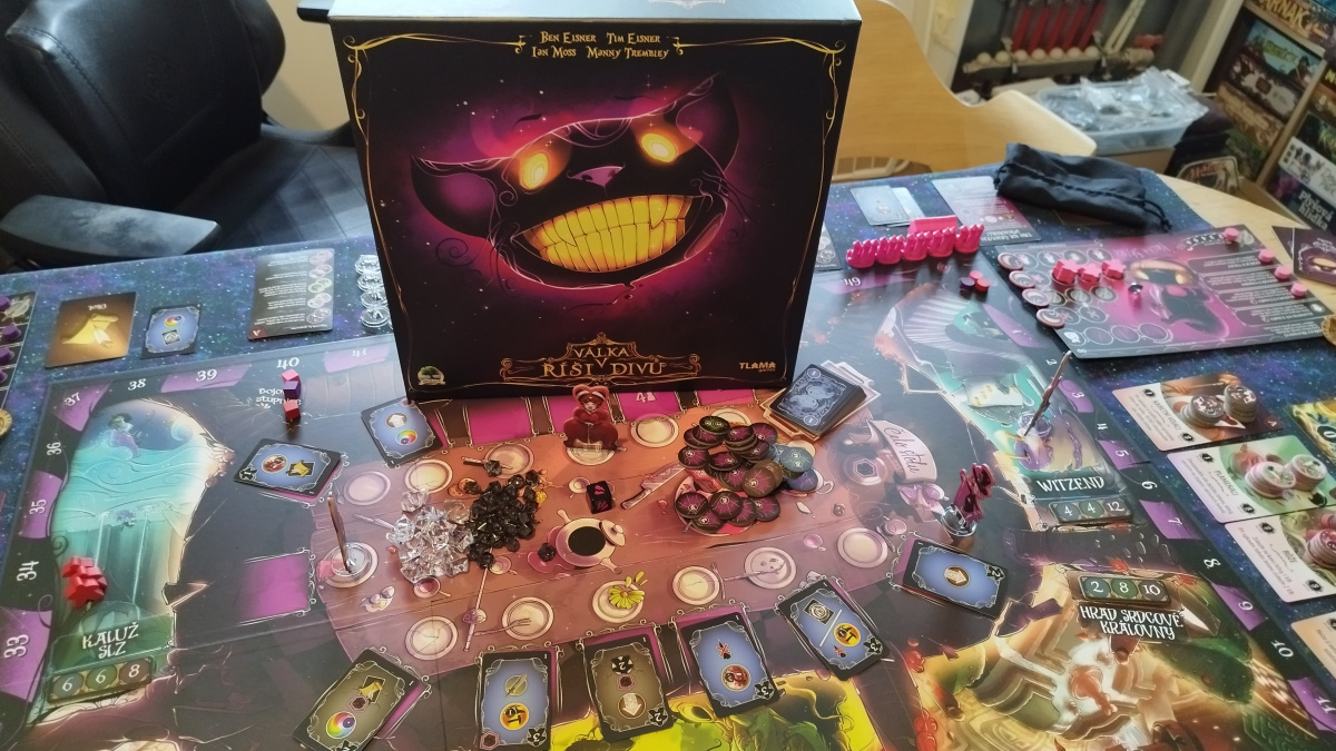 Po odkrytí víka, ze kterého se na vás šibalsky směje kočka Šklíba, a po nastudování potřebných pravidel, se před vámi rozprostře moc hezká a ve skutečnosti i dost promyšlená kombinace kontrolování oblastí, draftování karet a vytváření pytlíku dostupných sil, které osloví i nepříznivce předlohy. Protože i když se zápolení odehrává v Říši divů, tematických prvků tu není zase tolik a vybrané zasazení skutečně funguje spíše jako kulisa. Což pro někoho může být negativem, avšak pro mě jakožto někoho, komu značka moc neříká, se jedná o příjemný bonus.