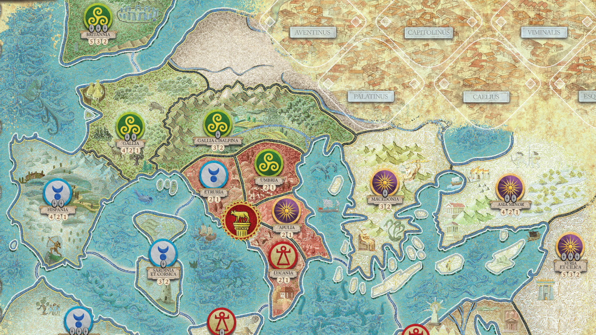 Tímto způsobem se snažíte dosadit členy své rodiny do římských provincií, z jejichž ovládnutí vám plynou příjmy a vítězné body, stejně jako do konkrétních budov, kde vám poskytují další výhody.