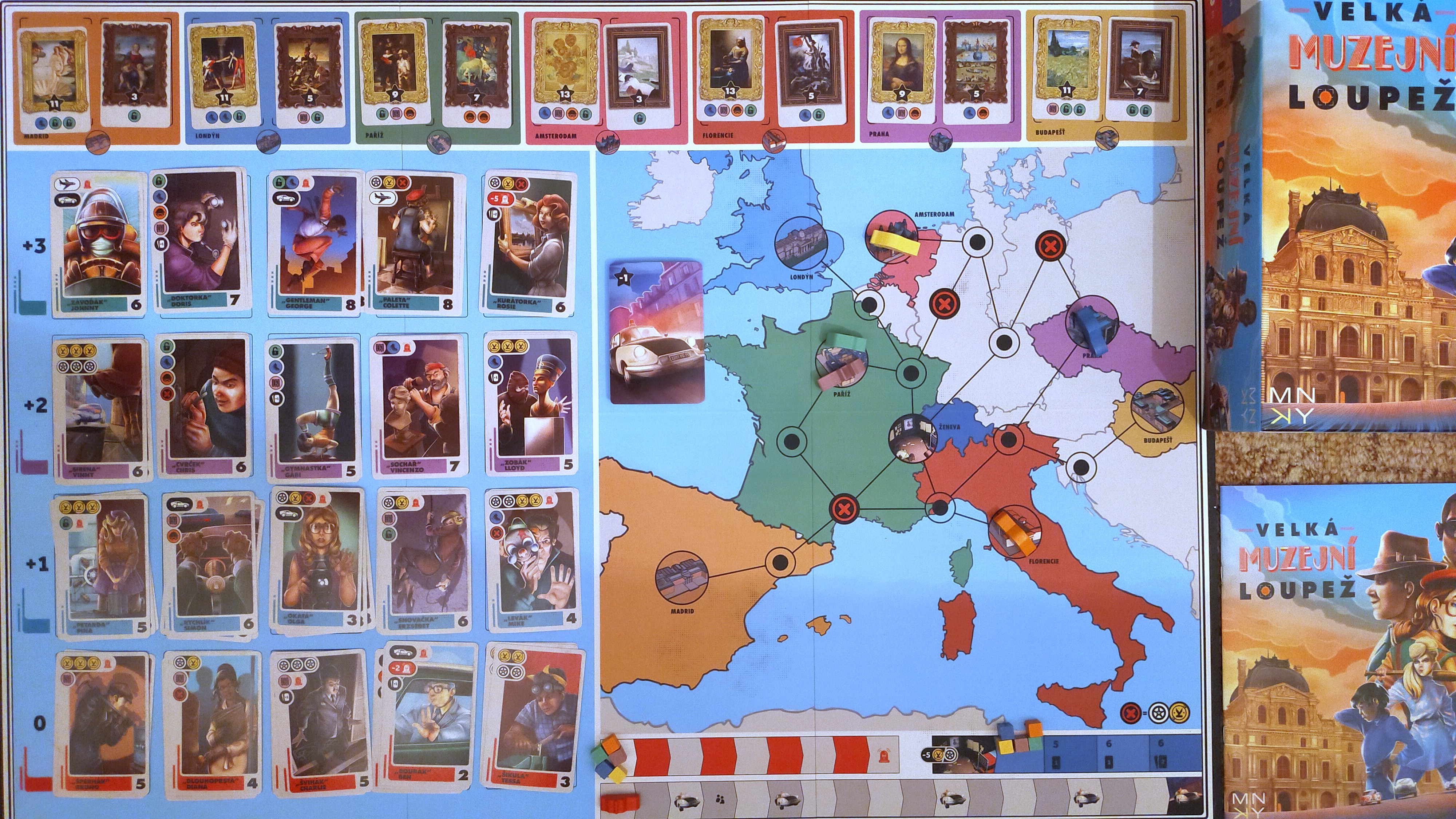 Nedávno vykradli Louvre, a tak není od věci se podívat na Velkou muzejní loupež. Kdo by nechtěl svým elegantním bourákem vyrazit na Eurotrip a ukořistit některá ze slavných děl? Autory jsou Nizozemci Robert Brouwer a Arjan van Houwelingen, od kterých jsme již recenzovali kooperativní Velkou pětku z africké savany. Česky hru vydávají rovněž Knihy Dobrovský.