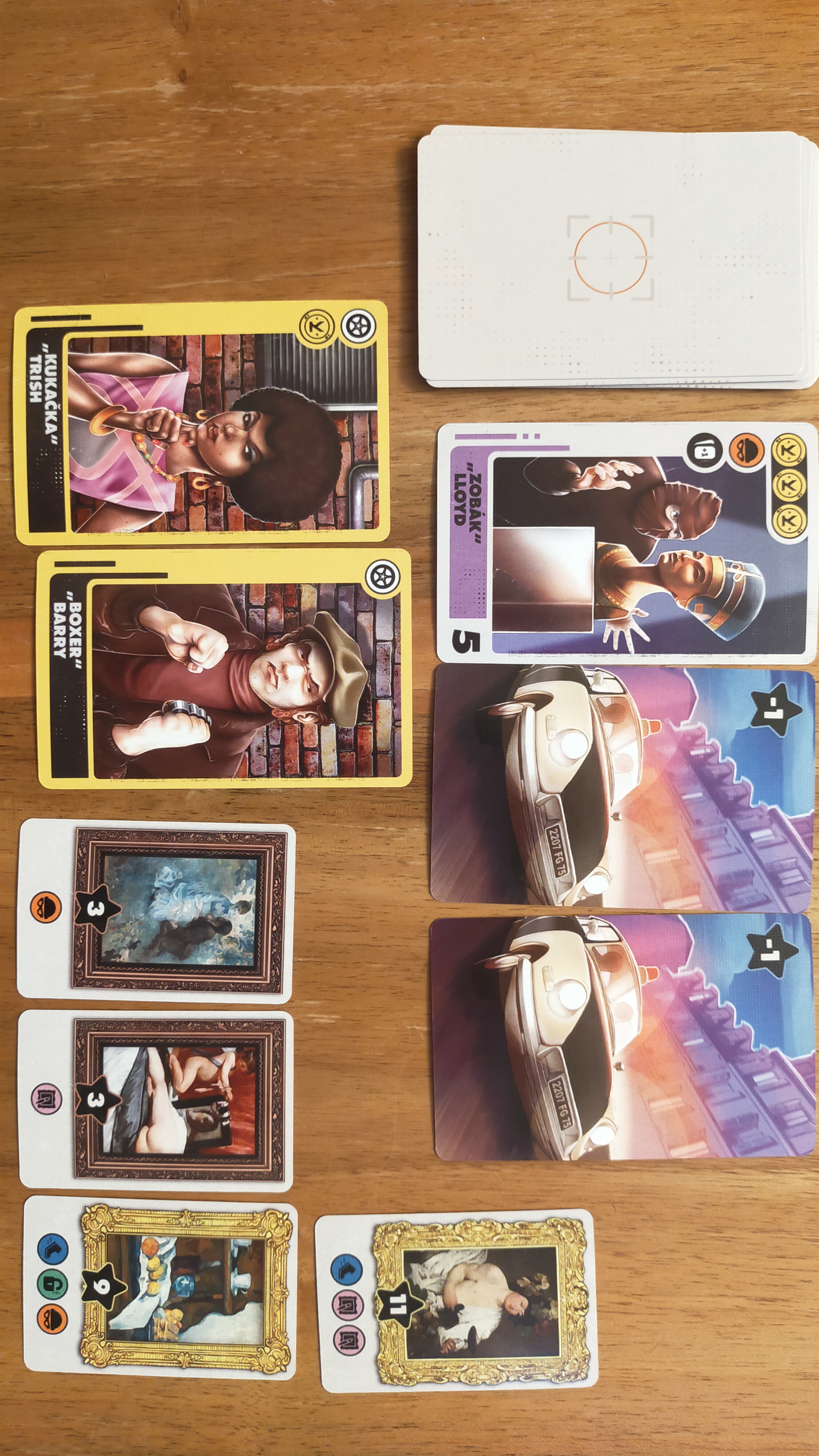 Je velká škoda, že hráči nemají ve startovním balíčku karty s některým efektem či alespoň startovní specialisty s některou schopností, tedy ikonou pro krádež obrazů. Prvních několik tahů je totiž o ničem, až postupně to začne nabírat na obrátkách. Má to ale i své přednosti, ať již jde o jednotlivé mechanismy rozvíjení své skrýše umožňující lepší práci s kartami na ruce, destičku únikového vozu s jedním symbolem, který později musíte vykoupit třemi, nebo zejména stupnici podezření, kdy se v hledáčku policie ocitnou všichni, kteří se nachází ve městě tehdy, když v něm dojde k loupeži.