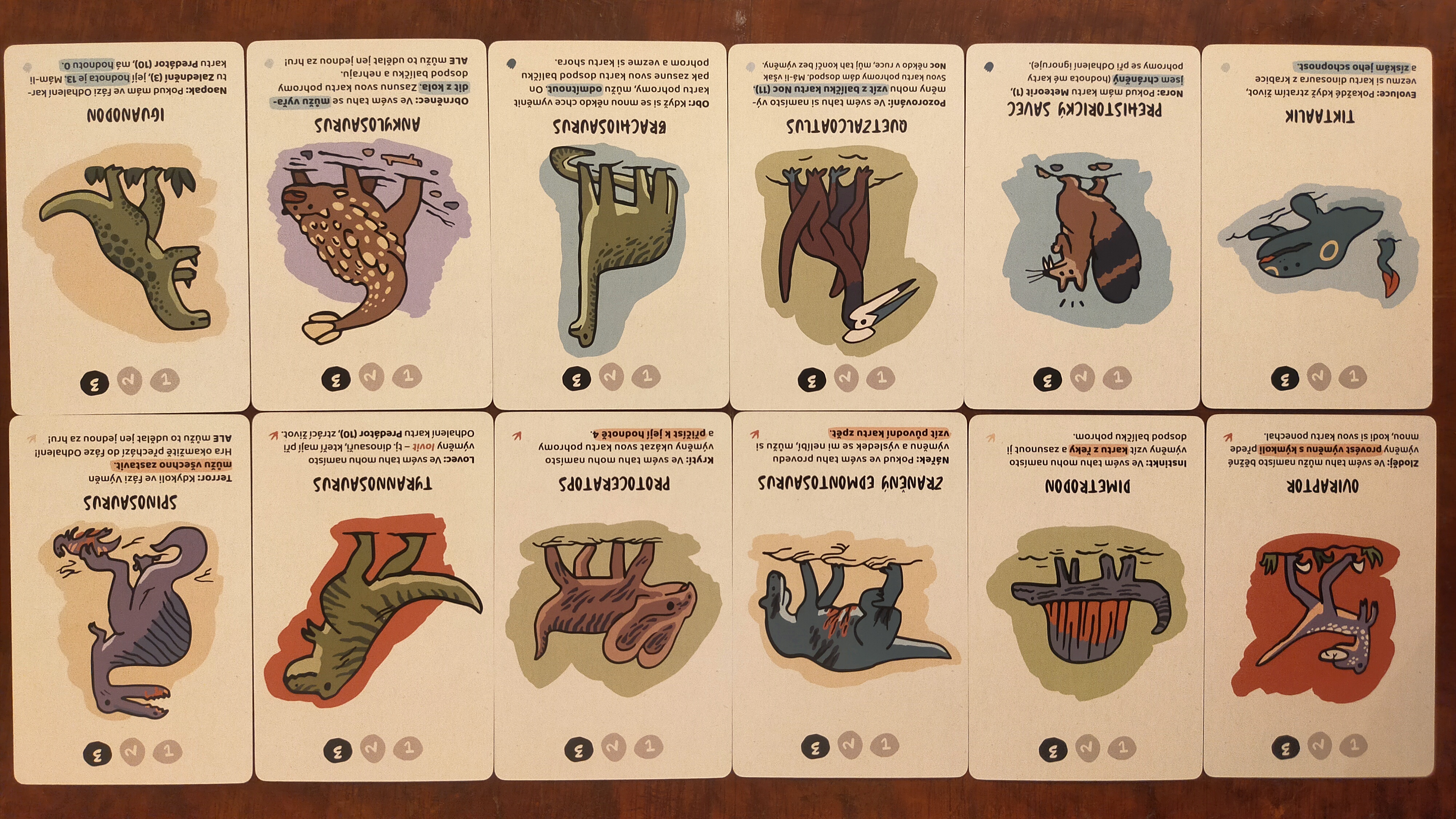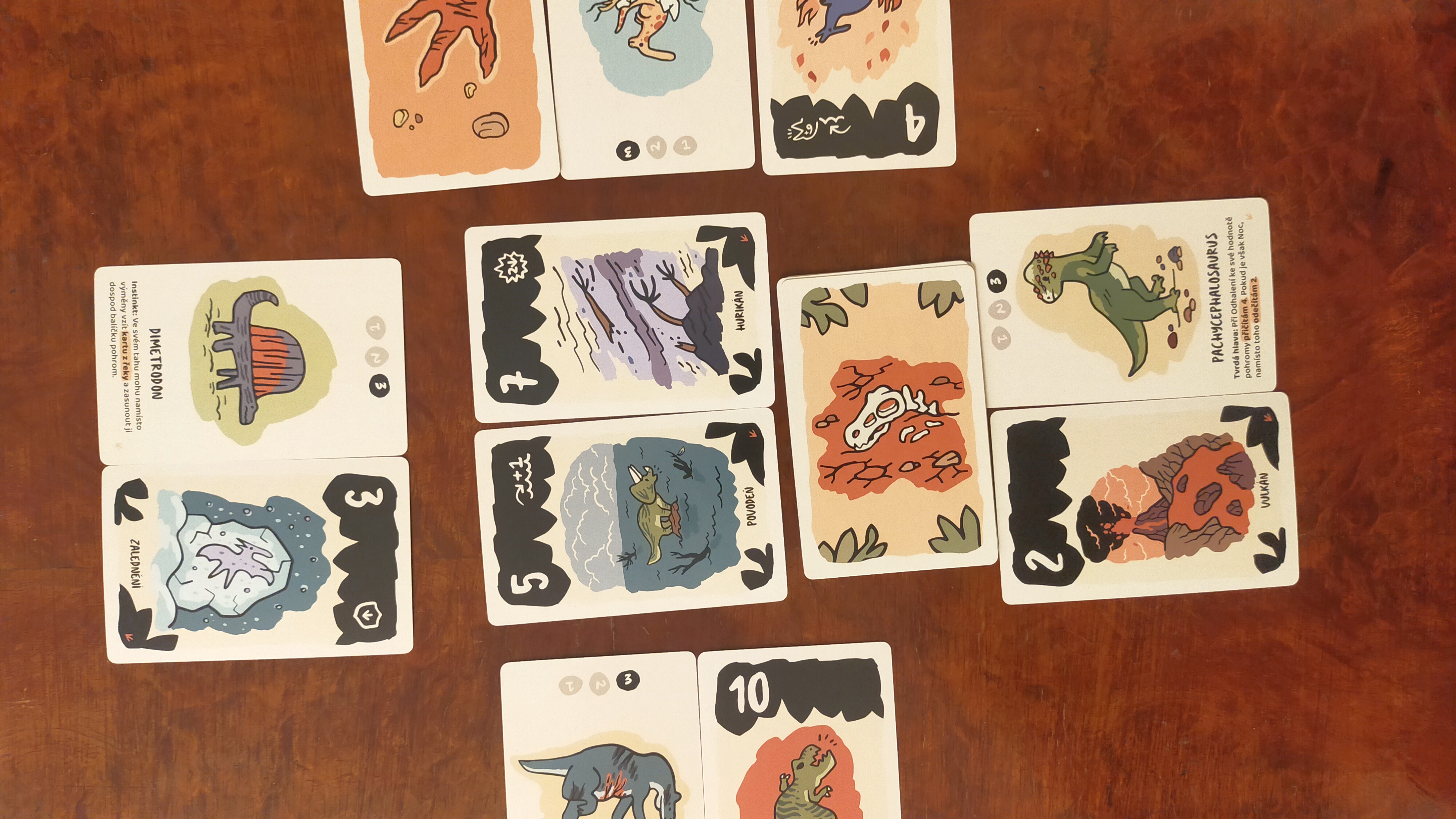 Zatřetí, pravidla vůbec neřeší nedostatek karet. Dozvíte se, že kolo je to, když všichni odehrají jeden tah, ale i ve třech hráčích po třech kolech jsme měli karty pohrom všechny použité, všechny dinouše naživu a nikdo nezmiňuje, zda se všechny karty míchají a pokud ano, tak kdy. Zda po jednom kole nebo když zcela dojdou. Ve třetím kole zmiňovaného případu tří hráčů totiž již nezbývá ani karta na vyložení do řeky.