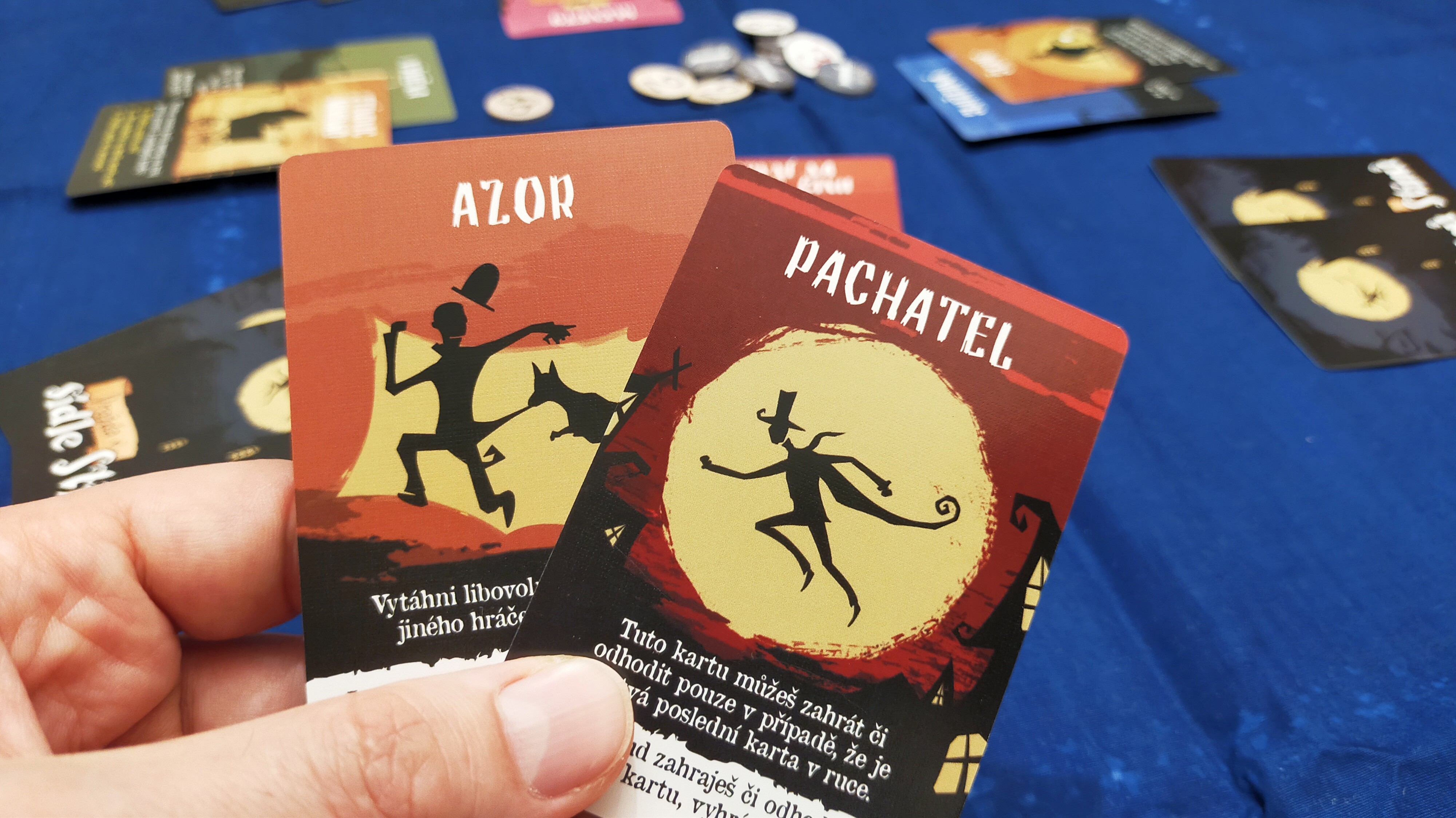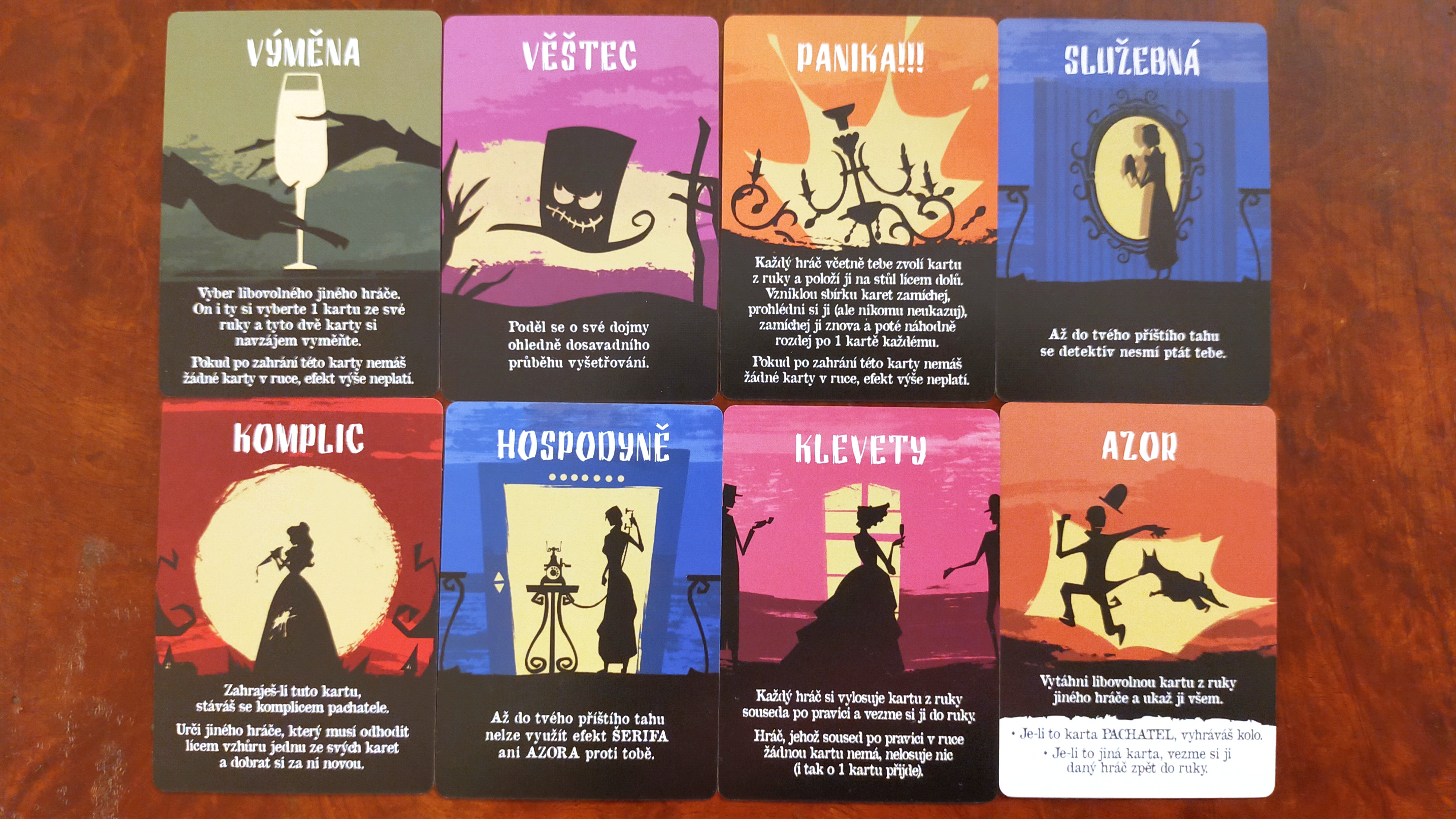 Jenomže pozor. Je tu ještě pes Azor. Smí vylosovat kartu z ruky podezřelého a je-li to karta pachatele, vítězí on. A šerif zvítězit sám o sobě nemůže, nicméně položí-li žeton želízek před pachatele a on s ním skončí, je to cesta. V neposlední řadě tu je komplic, který se jím stává dobrovolně při vyložení karty, přičemž jím může být i takto zdiskreditovaný detektiv, ale i skutečný pachatel v rámci svého blafu. Více o efektech najdete v naší fotogalerii.