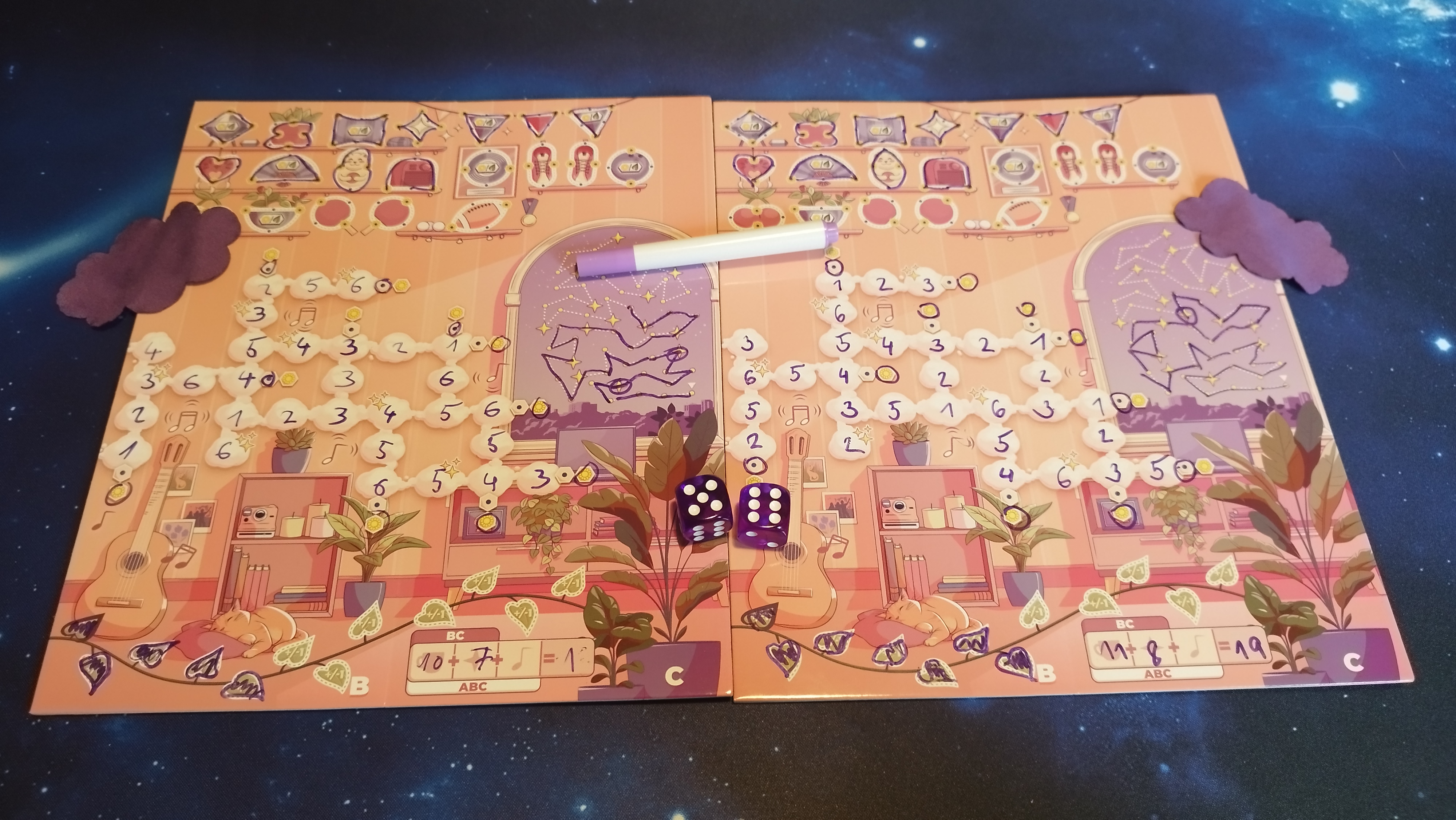 Skládací herní deska v sobě skrývá hned osm různých kombinací, které se liší náročností i dodatečnými bodovacími podmínkami. Někdy tak budete kromě prostého vyplňování předmětů i tvořit souhvězdí, jindy se snažíte trefit správné noty identickými čísly, a někdy si chcete ty nejlepší momenty zvěčnit fotografiemi.