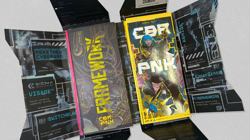 CBR+PNK: Augmented je tzv. pamfletové RPG. Není to knížka ani sešit; je to stylové rozkládací pouzdro z tvrdého papíru, ve kterém najdete 12 skládacích, hustě popsaných letáčků. Jeden s pravidly hry, pět s deníky postav, dva předpřipravené scénáře, jeden popisující setting hry a tři s doplňkovými pravidly pro kampaňový formát, speciální nepřátele a doplnění jinak ryze kyberpunkového světa o okultní elementy.