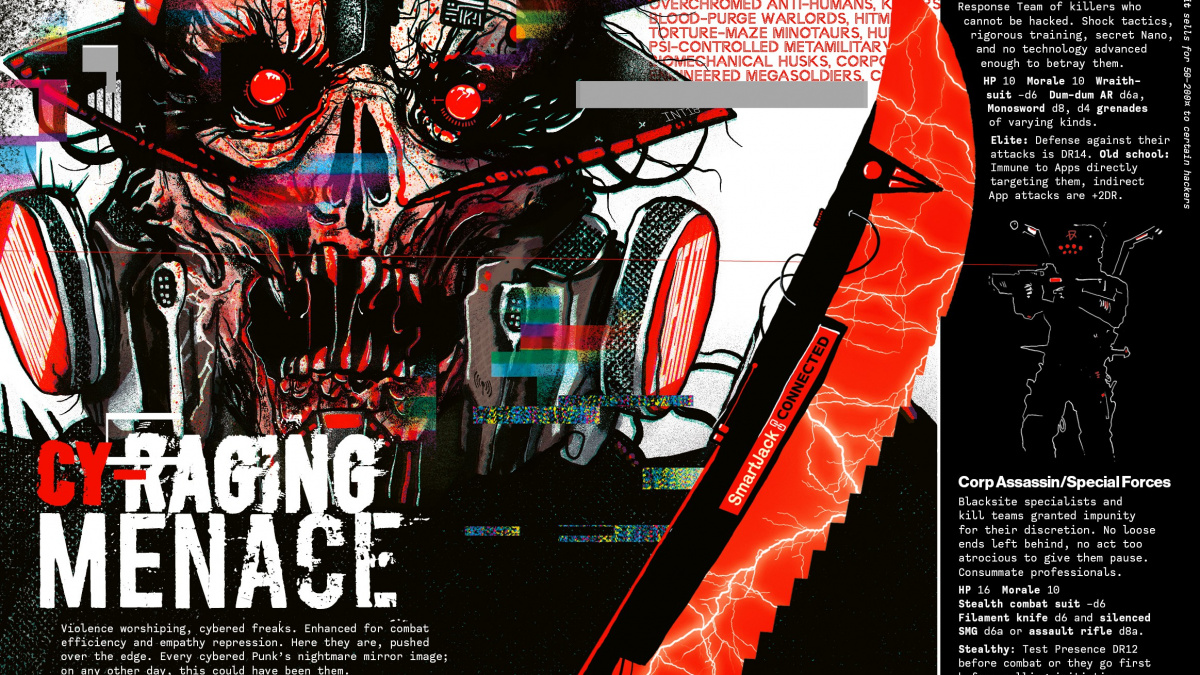 I přesto mi ale po dočtení svět CY_BORGa připadá stále tak těžko představitelný. Obecně je v samotném textu málo pevné, hmatatelné substance (opět, víme proč: Protože ji mají hře dodávat sami hráči), ale ta, která mu chybí nejvíc, je lidskost. Nejcivilnějším motivem celé příručky je dluh, který hlavní postavy do začátku mají a musí splatit – všechno ostatní už se pohybuje jen ve vysoko-oktávových otočkách zmaru, zběsilosti, krve a bizáru.