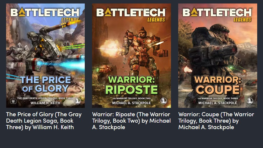 Jsou mezi nimi základní kameny loru jako trilogie Legie Šedé smrti (Gray Death Legion), trilogie Warrior popisující události vedoucí ke Čtvrté následnické válce nebo trilogie (ano, je tam hodně trilogií) Kerenského krev (Blood of Kerensky), která čtivě uvedla do světa BattleTechu jeho asi nejvlivnější zvrat, totiž drtivý příchod klanů.